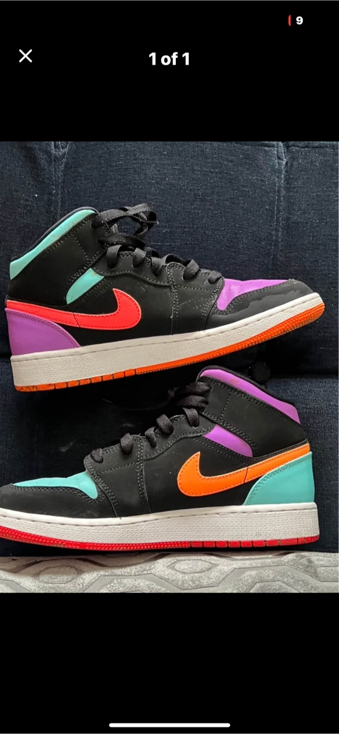 These Air Jordan 1 Mid SE GS sneakers feature a black base with vibrant "Siren Red," turquoise, and purple accents. They're a mid-top silhouette with classic Nike Air Jordan detailing. Suitable for everyday wear or light activity. Size 5Y