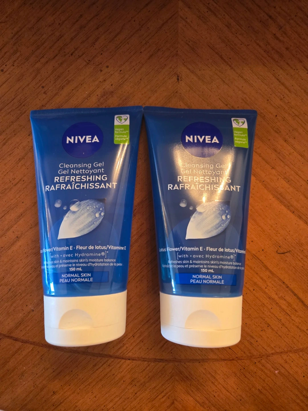 Two tubes of NIVEA Refreshing Cleansing Gel for normal skin. It's formulated with Lotus Flower and Vitamin E, with Hydramine. Each bottle is 150 mL. This gel refreshes skin and maintains its moisture balance.