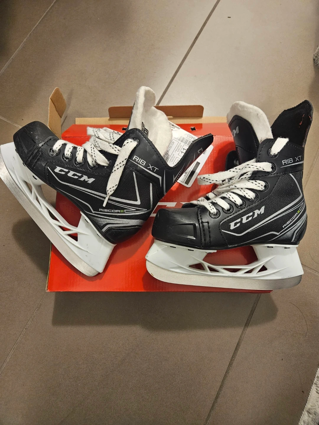 These CCM Ribcor XT hockey skates are designed for young players. They feature a comfortable interior and durable construction. This pair comes in youth size 11Y, or EU 29.