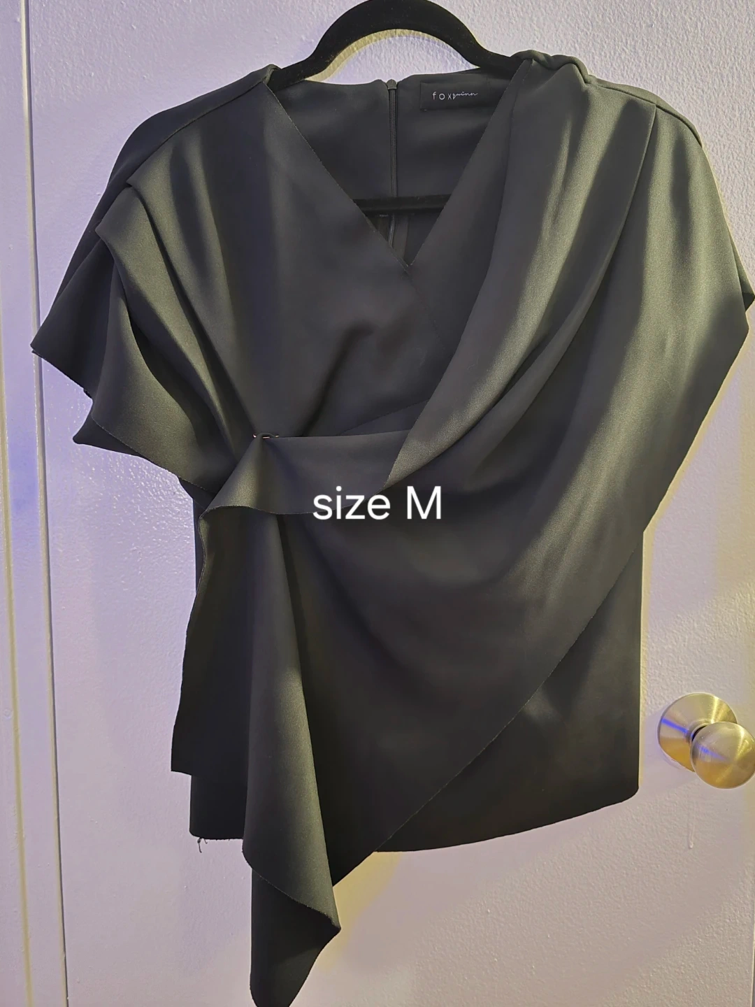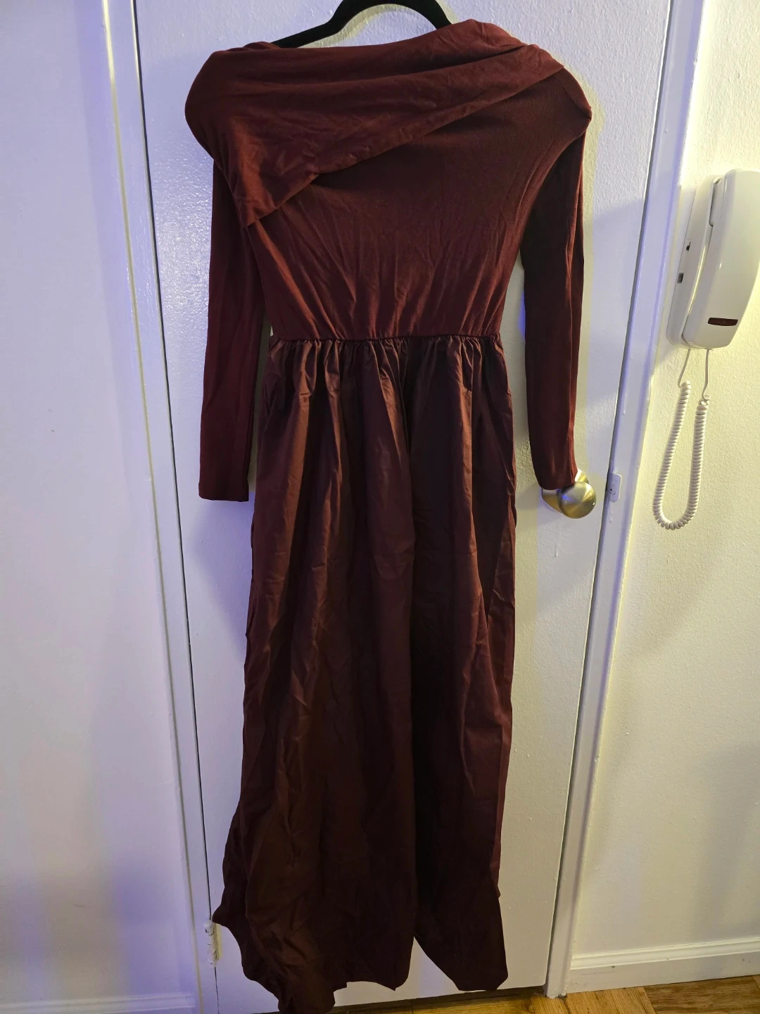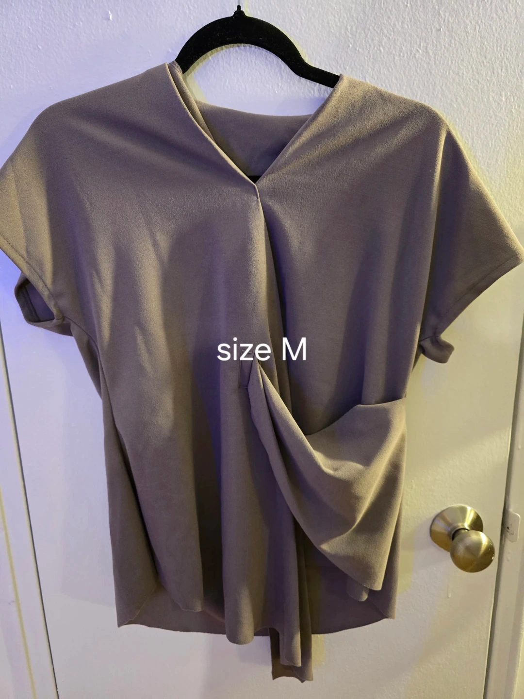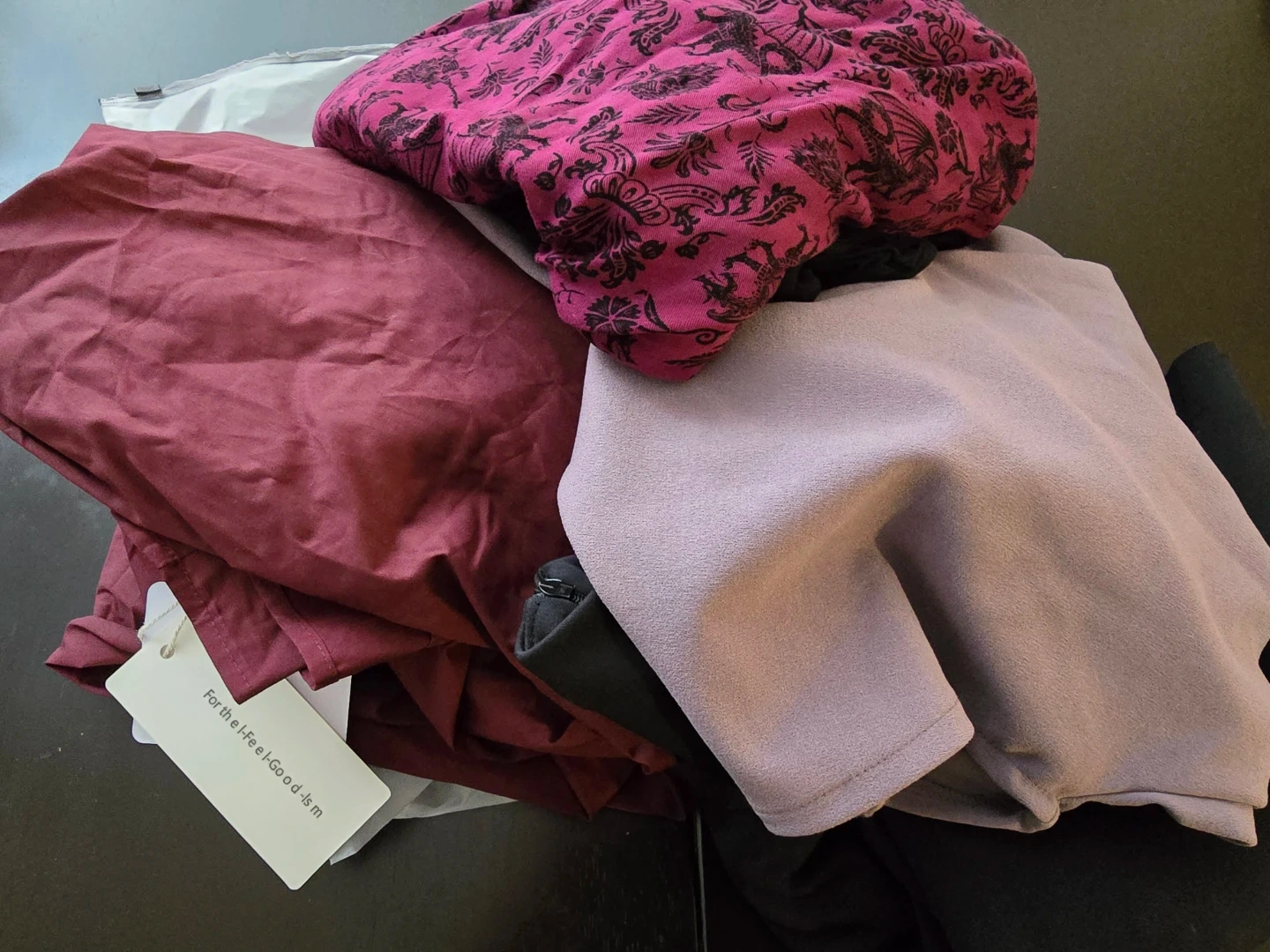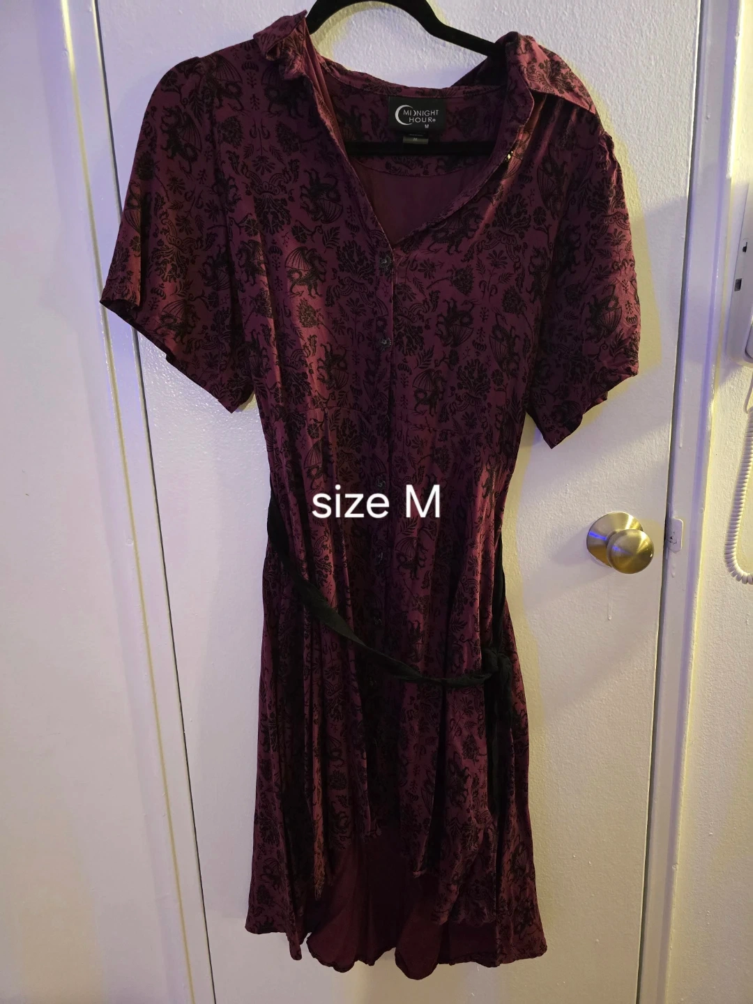 Bundle of 4 women's size M apparel items. Includes a maroon dress with a black pattern, a black asymmetrical top, and a mauve V-neck top. All are in size medium.