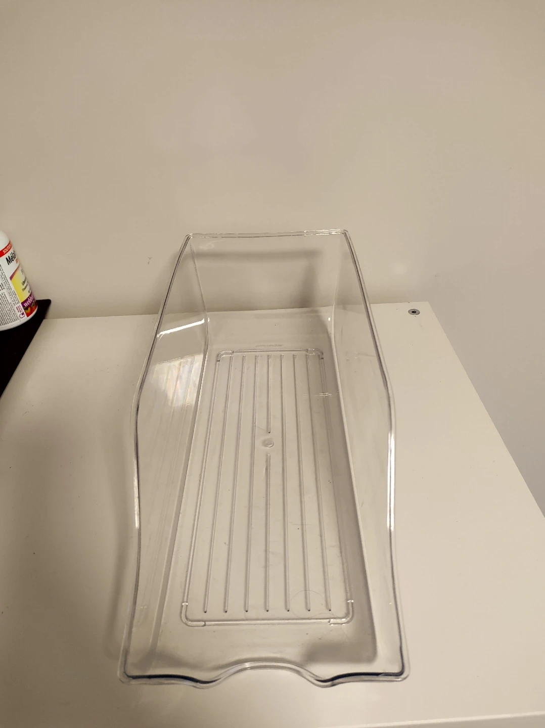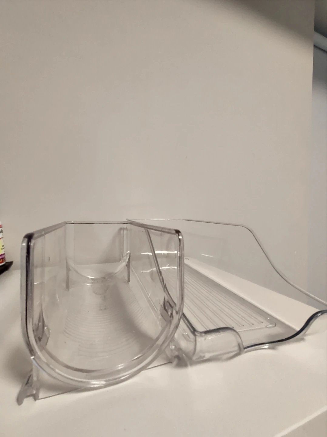 This clear plastic organizer is designed for fridge or pantry use. It's a rolling drawer with a ribbed base for stability. Makes accessing items easy!