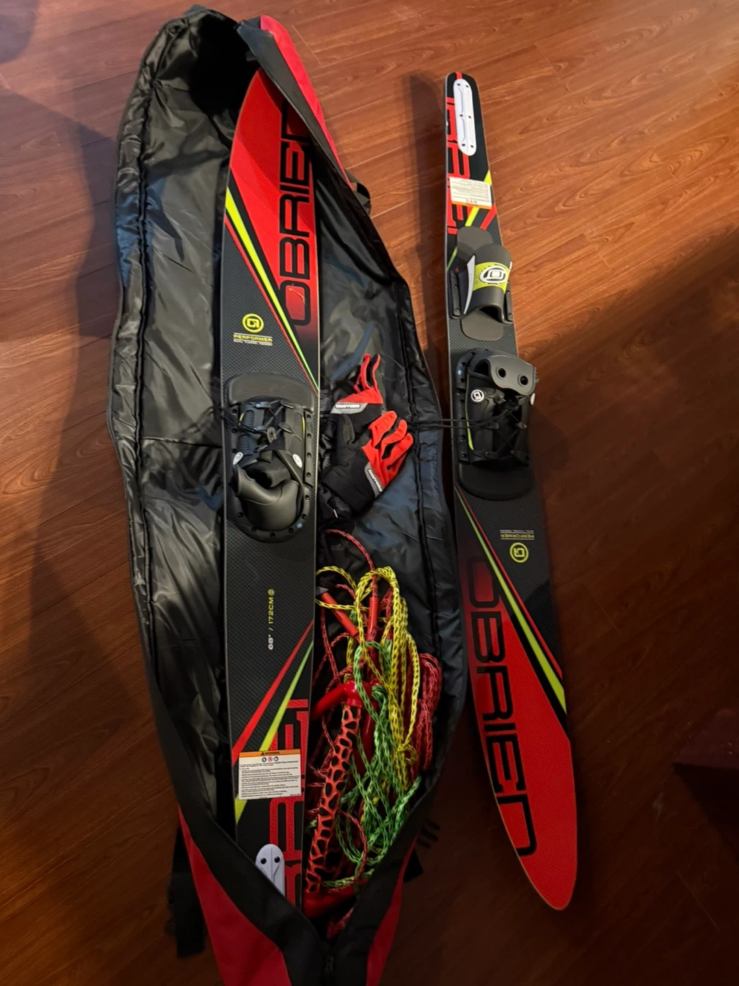 O'Brien combo water skis in a carrying bag. Includes tow rope and a pair of gloves. These skis are 67 inches / 170 cm long. Used less than a handful of times, selling because we’re moving.