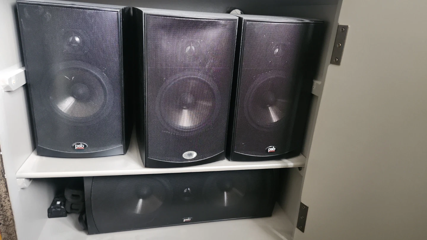 This listing includes a Yamaha Natural Sound AV Receiver RX-V567 and a set of PSB speakers, including a subwoofer. They're black in colour. This system provides a great audio experience.