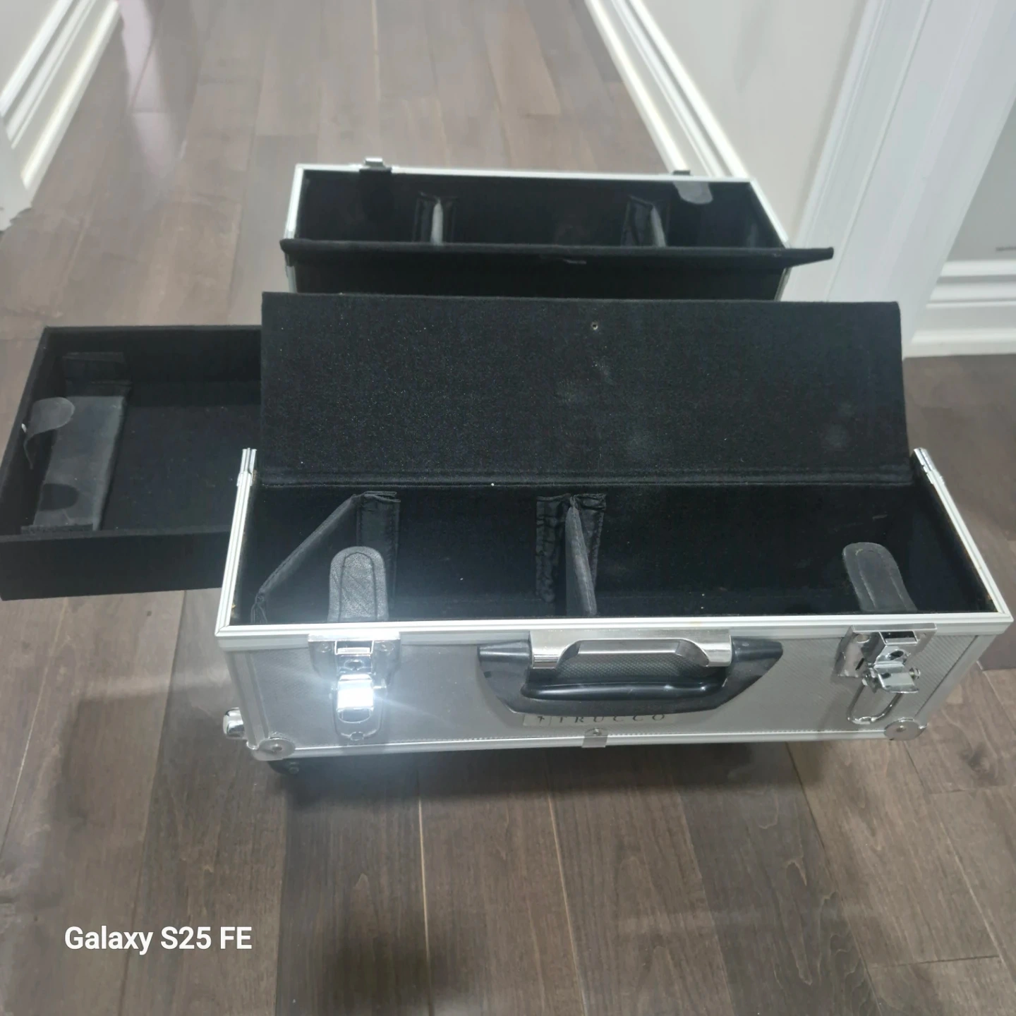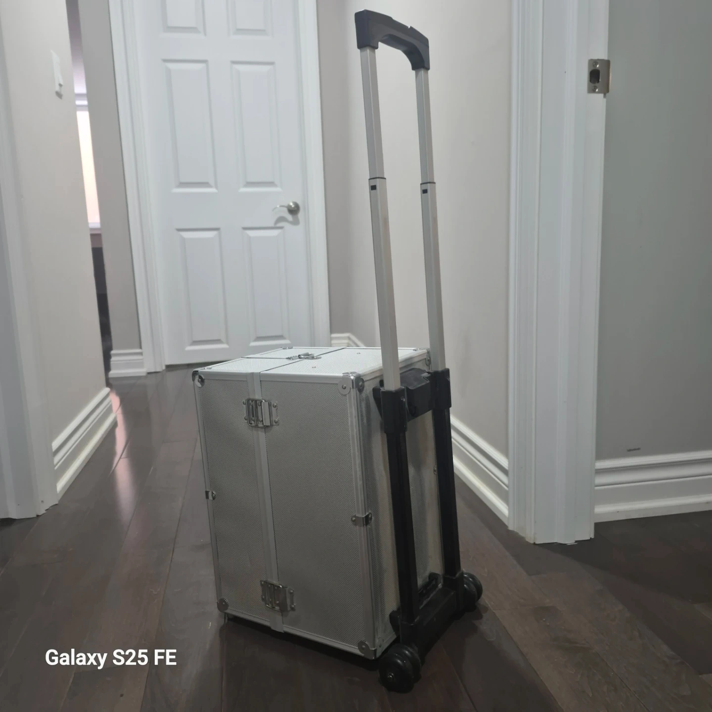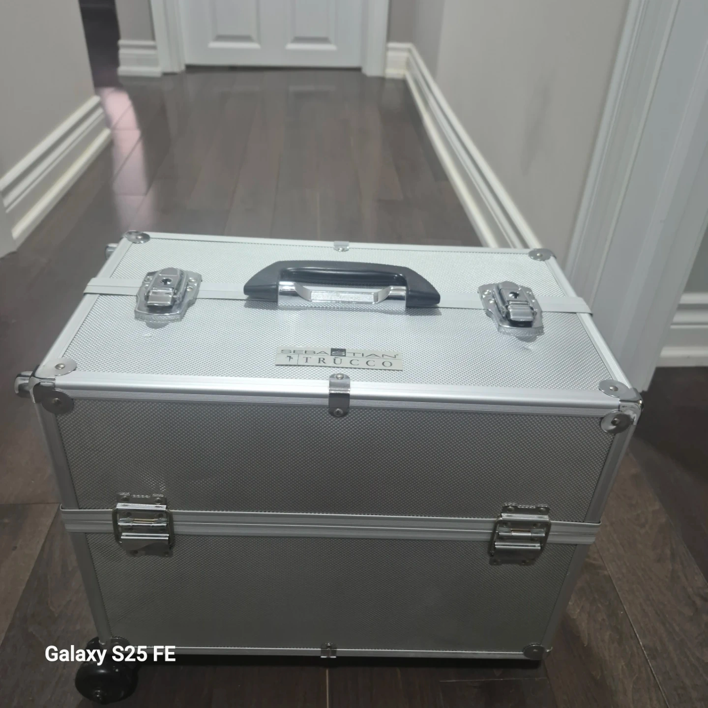 SEBASTIAN TRUCCO rolling makeup train case with silver aluminum exterior. It features a retractable handle and wheels for easy transport. The interior has multiple compartments and a removable tray.
