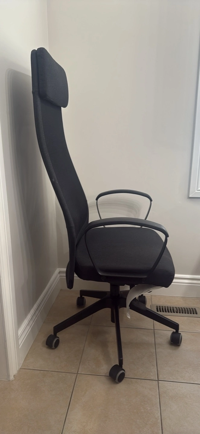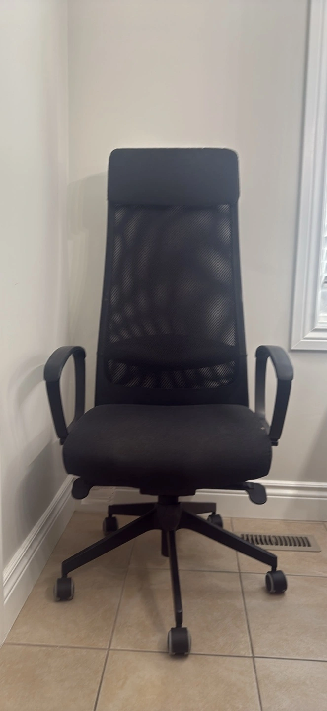 Selling a black office chair. It's in good condition and ready for a new home office setup. This chair provides great support for long hours of work or gaming. It features a high backrest and multiple adjustments for personalized comfort
