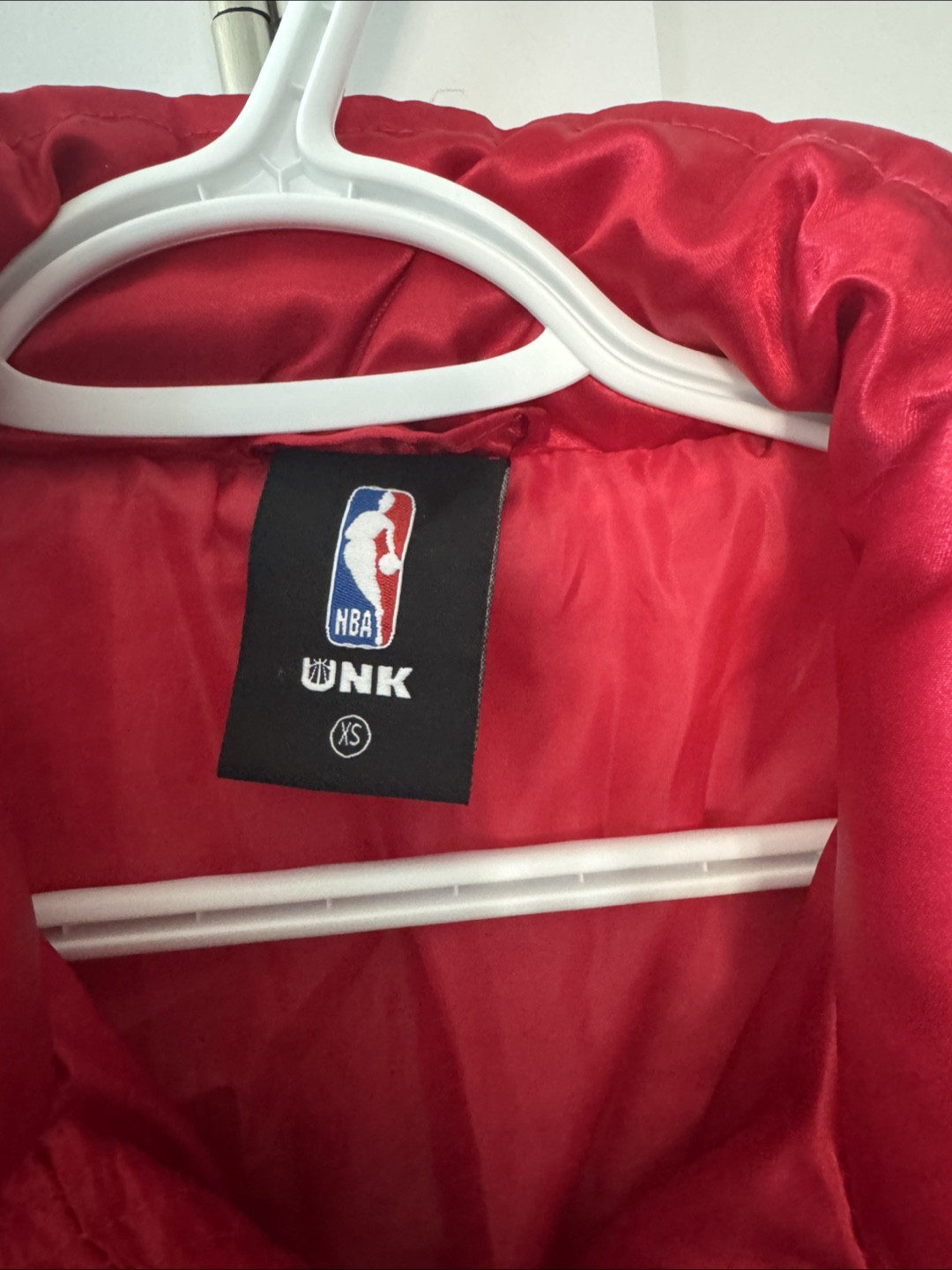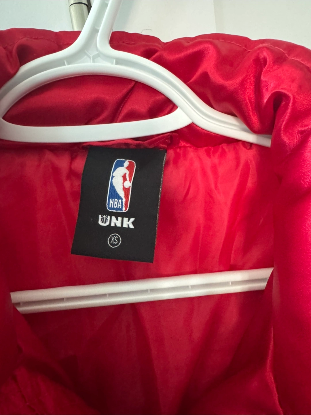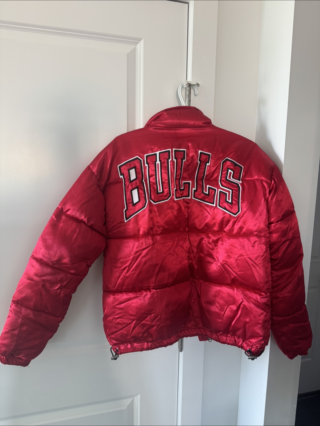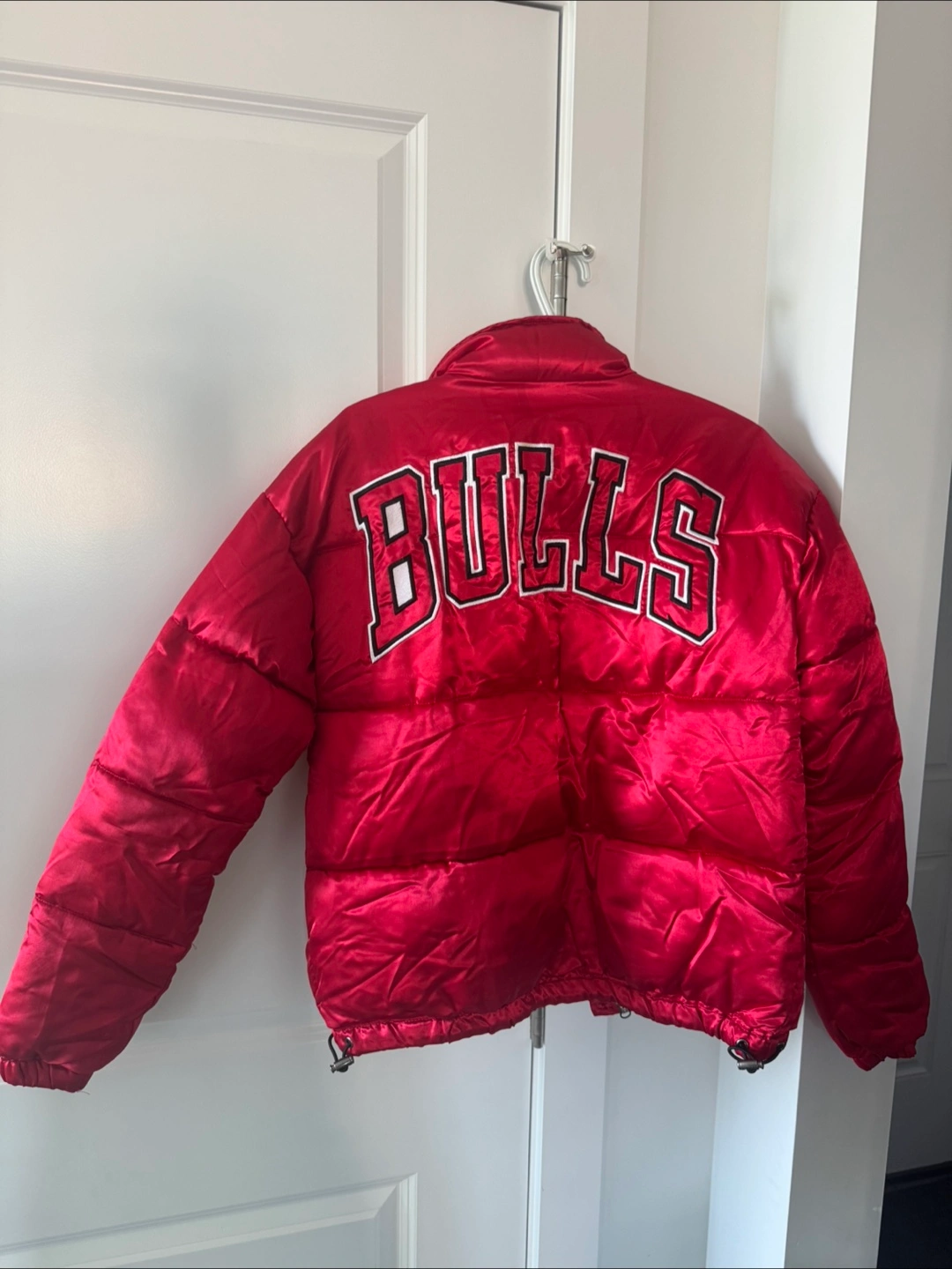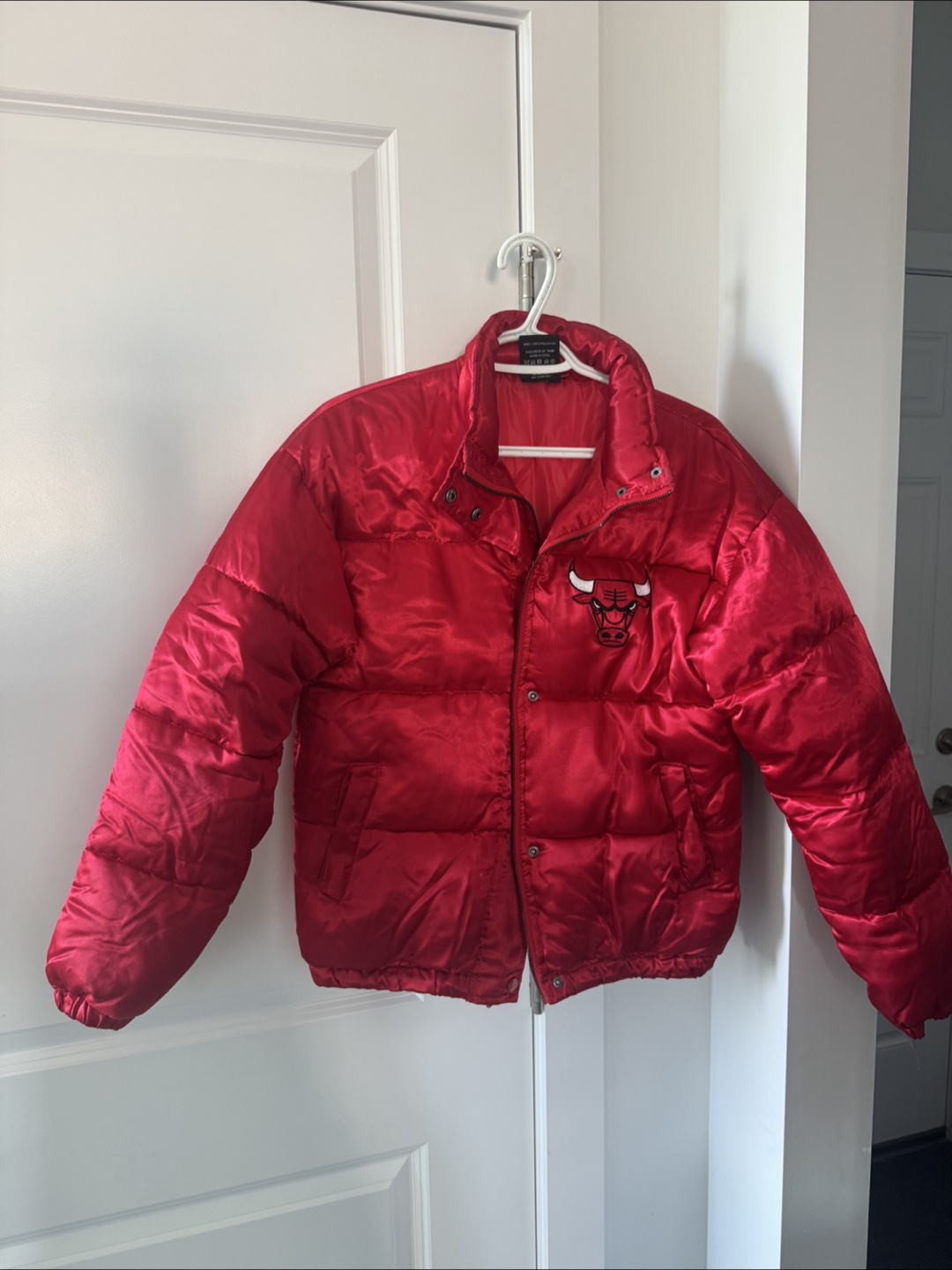 Selling a red NBA Chicago Bulls puffer jacket. It's in great condition and perfect for showing off your team spirit! The jacket is a size XS.
