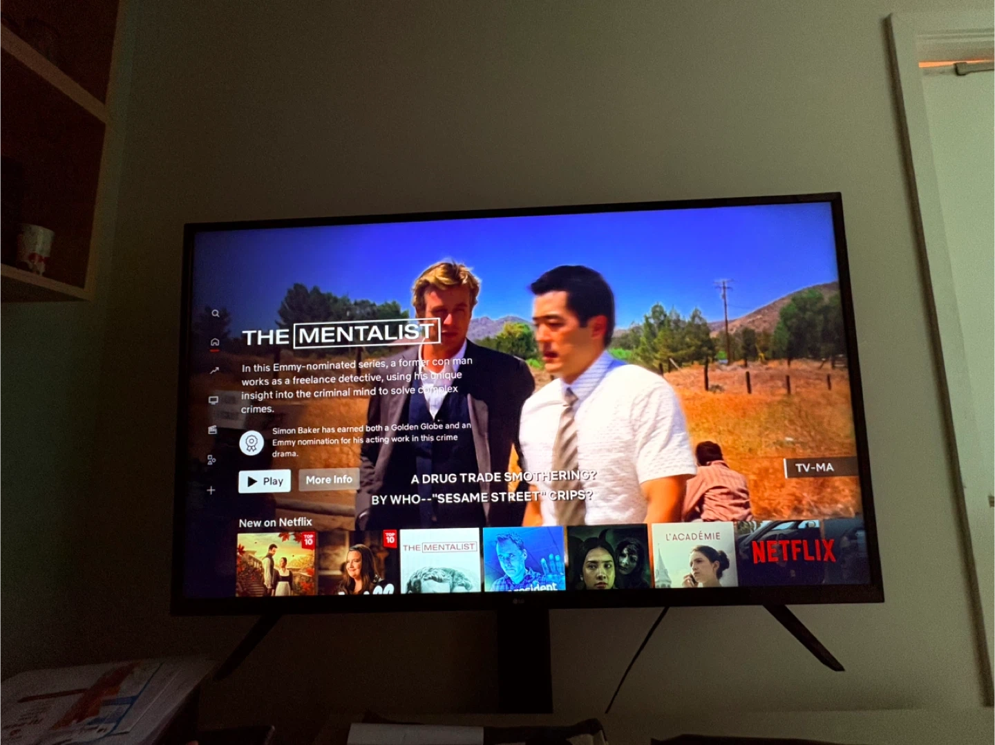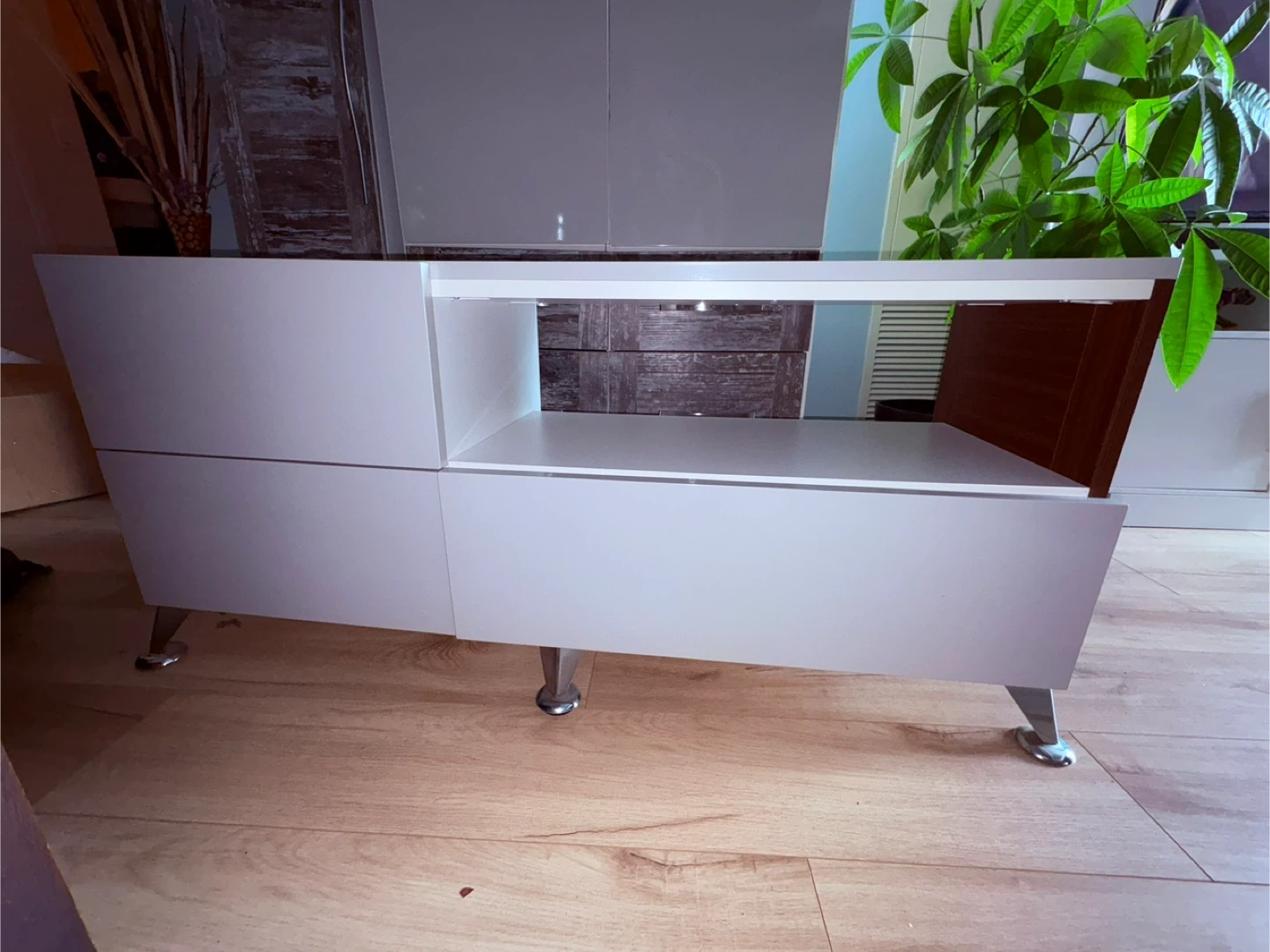 LG smart tv with a white stand for it features drawers and open shelving for storage. Perfect for organizing your entertainment setup.