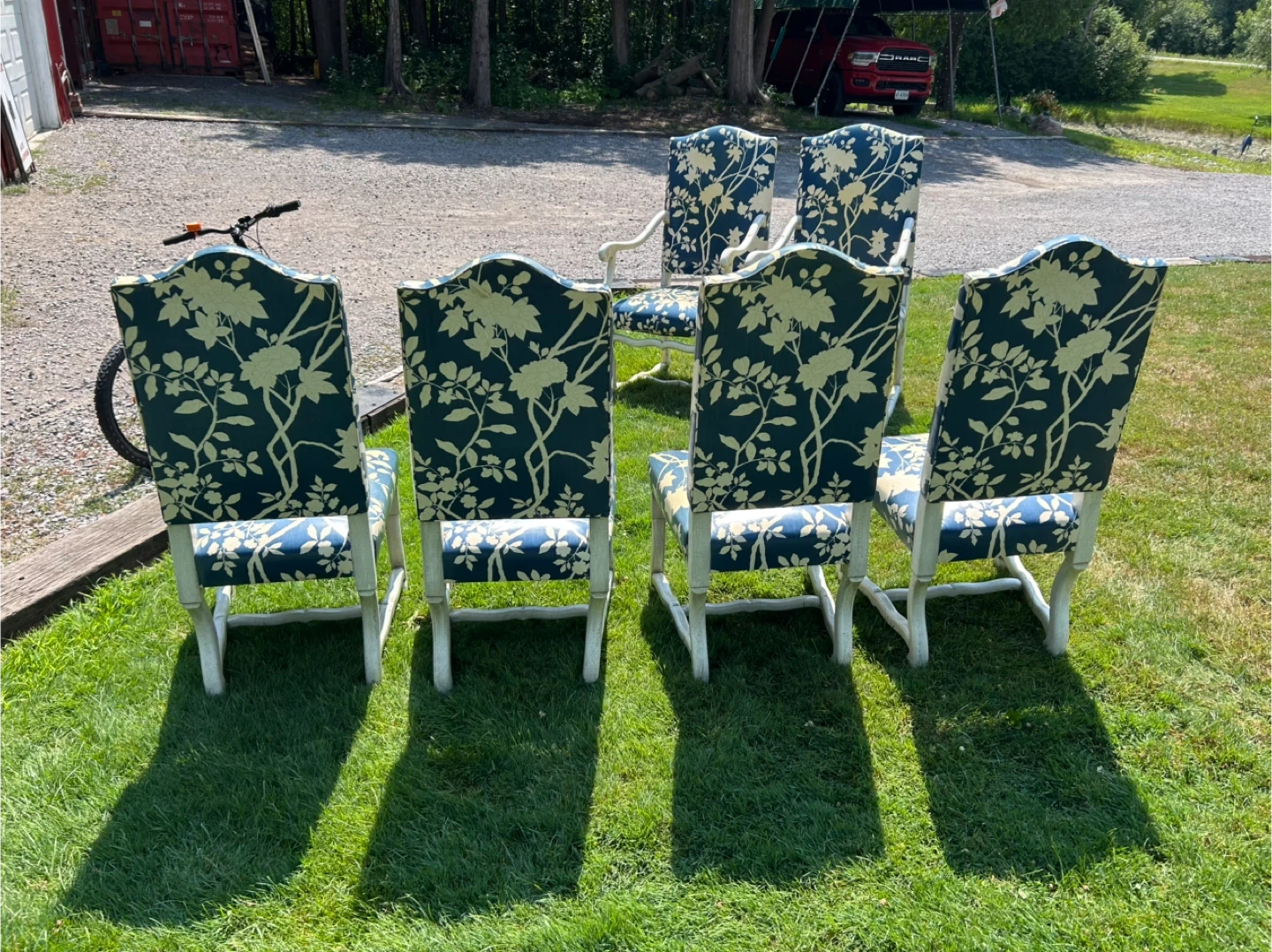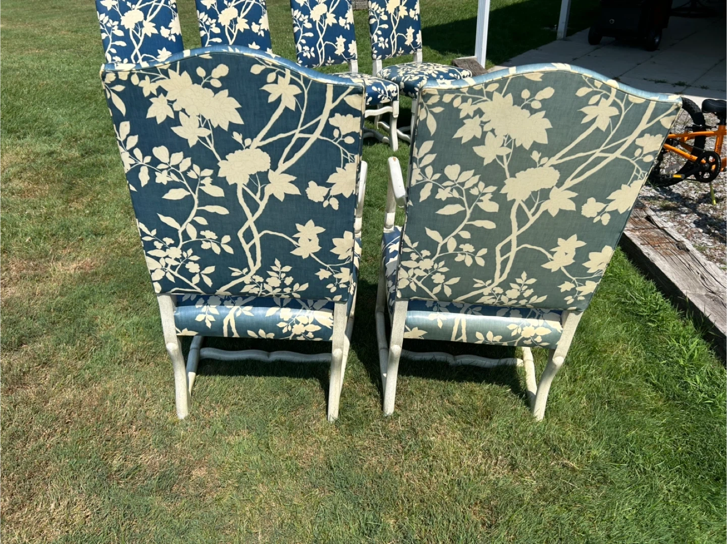 Six dining chairs with a blue vinyl . Features a scalloped trim on the apron and white wooden frames. These chairs are upholstered in vinyl