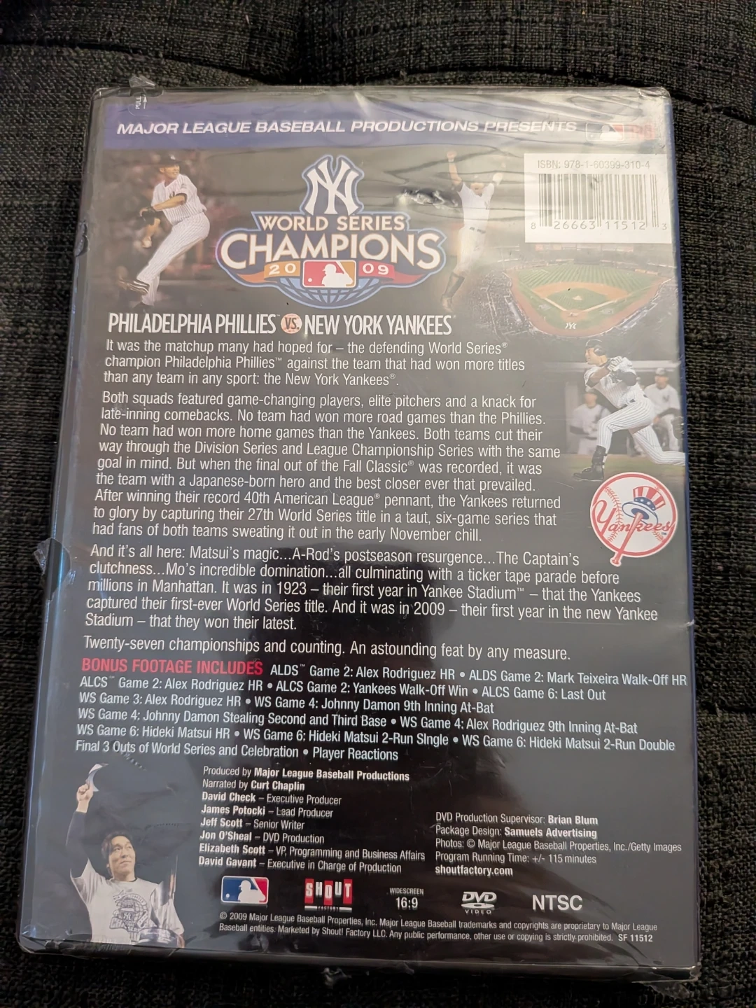 This DVD documents the 2009 World Series, featuring the Philadelphia Phillies against the New York Yankees. It includes bonus footage like ALCS Game 2 and highlights from the World Series.