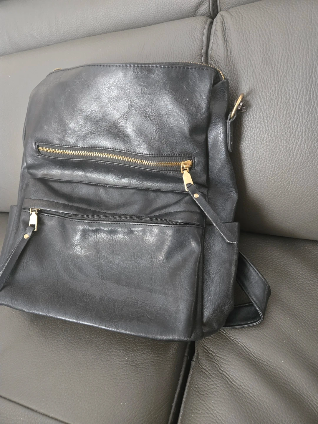 This black backpack is made from faux leather. It has multiple zippered pockets for storage. It's a versatile bag for everyday use.
