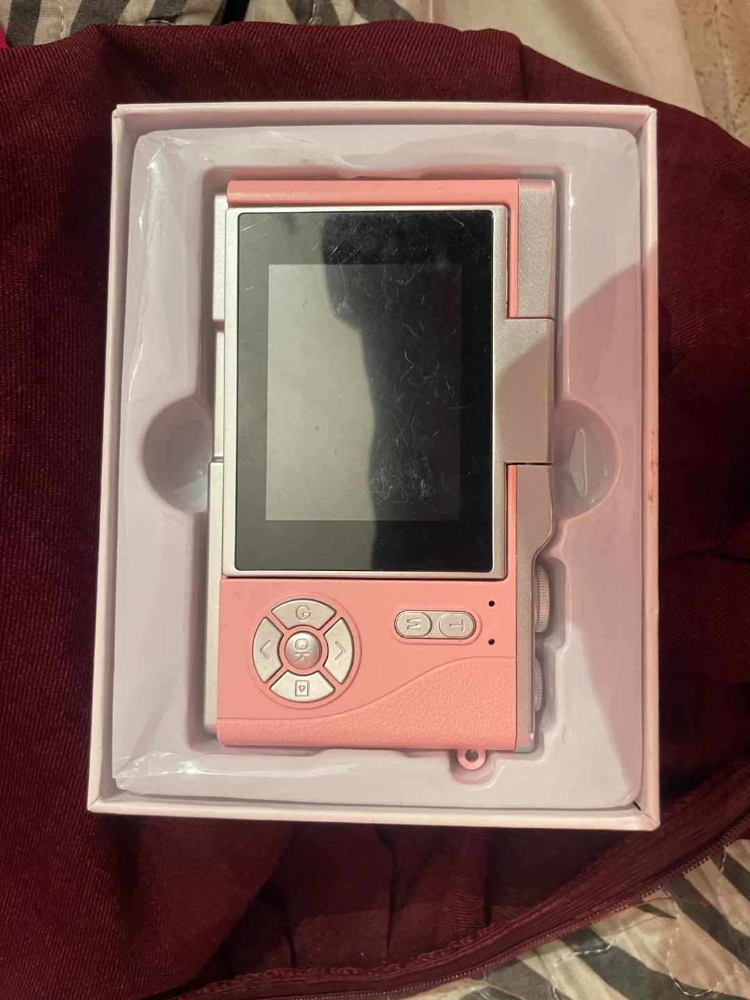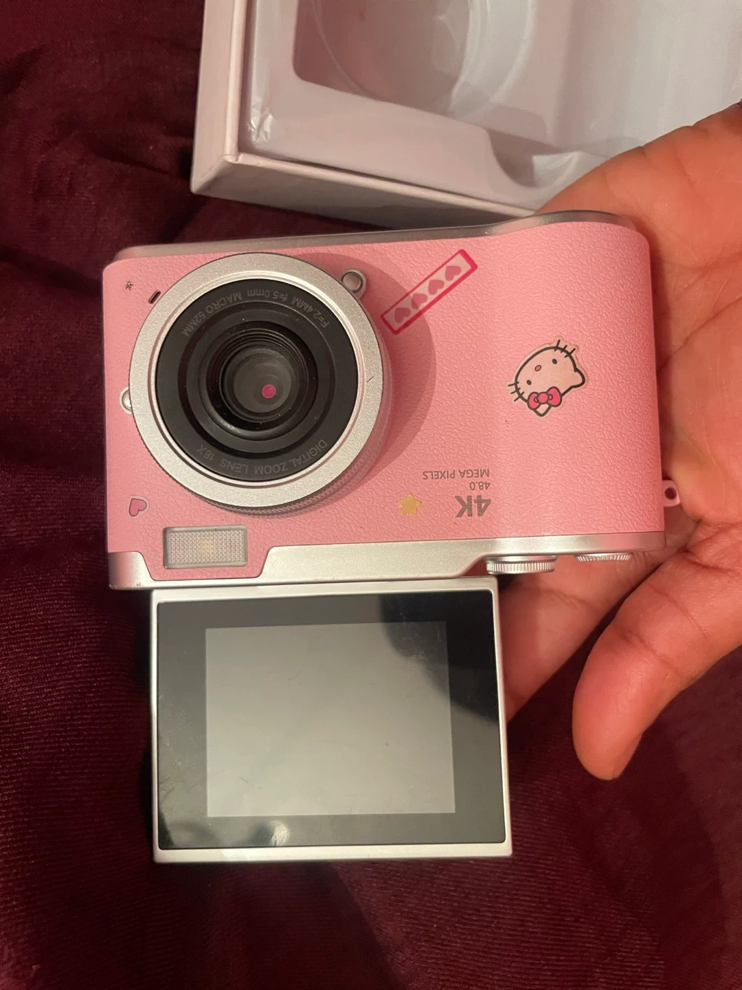 This is a pink digital camera featuring Hello Kitty graphics. It supports 4K resolution and 48.0 megapixels. The camera comes in its original box. For kid use in my opinion.