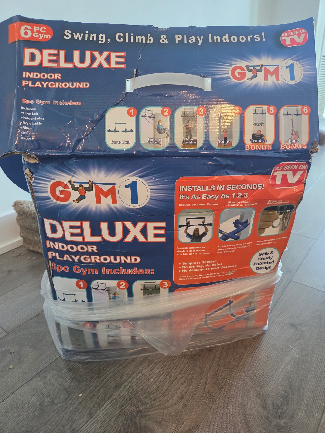 Indoor swing, rope ladder, rings, trapeze, and a bonus rope. All attachments compatible with doorway pull up bar such as one pictured. May need carabiners to attach.