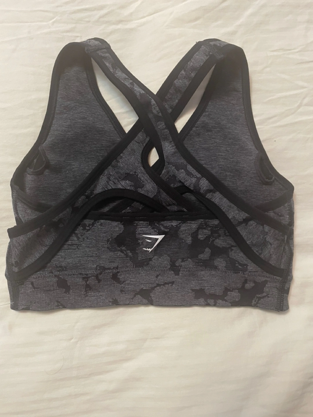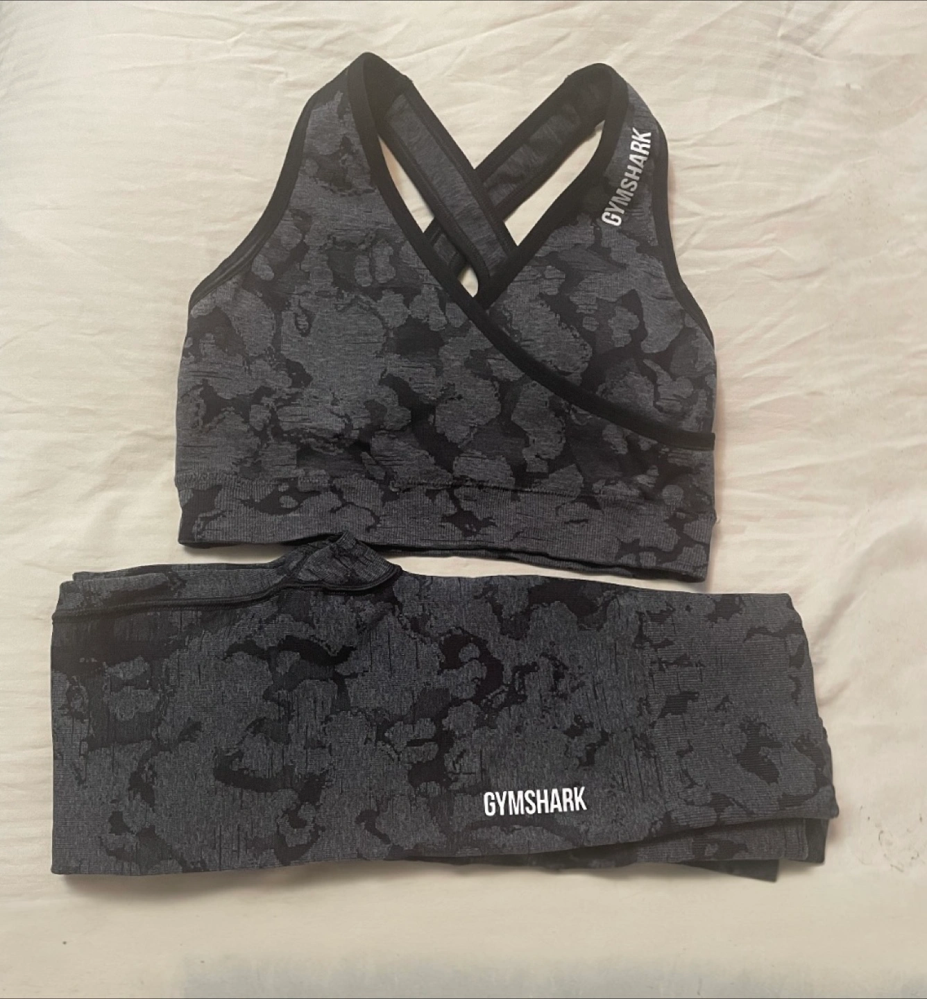 New Gymshark matching workout set, size small, features a stylish black and grey camo pattern, perfect for your active lifestyle. Includes a sports bra and leggings. Sfpfh. Ajax. Rossland and Salem area