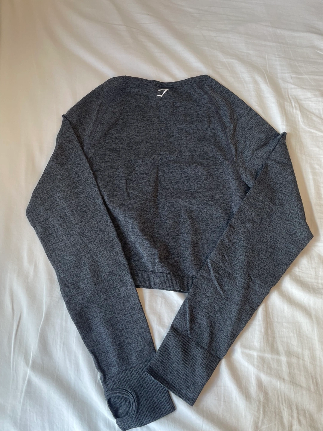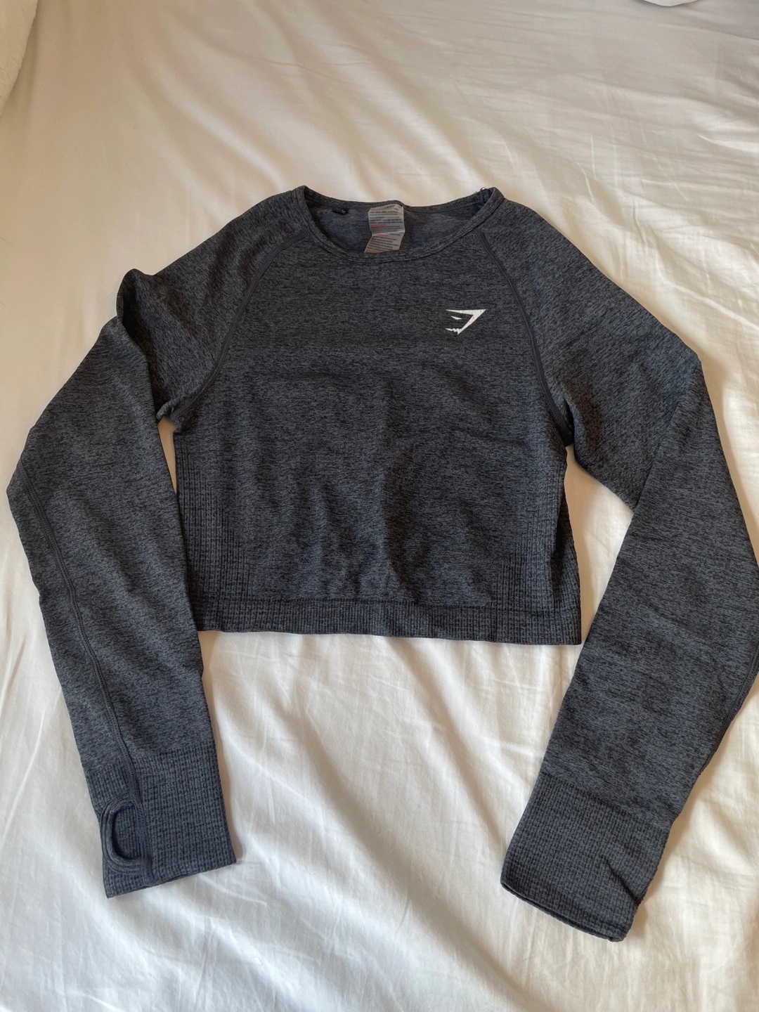 Selling a Gymshark long sleeve crop top in a lovely grey colour! It's in great condition and perfect for workouts or just lounging around. The material is super comfy and the design is really flattering. Feel free to message me with any questions!