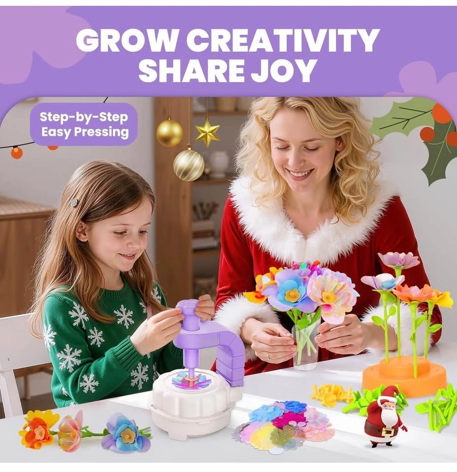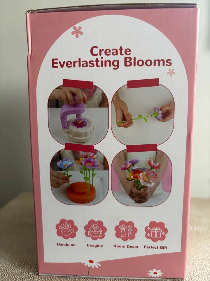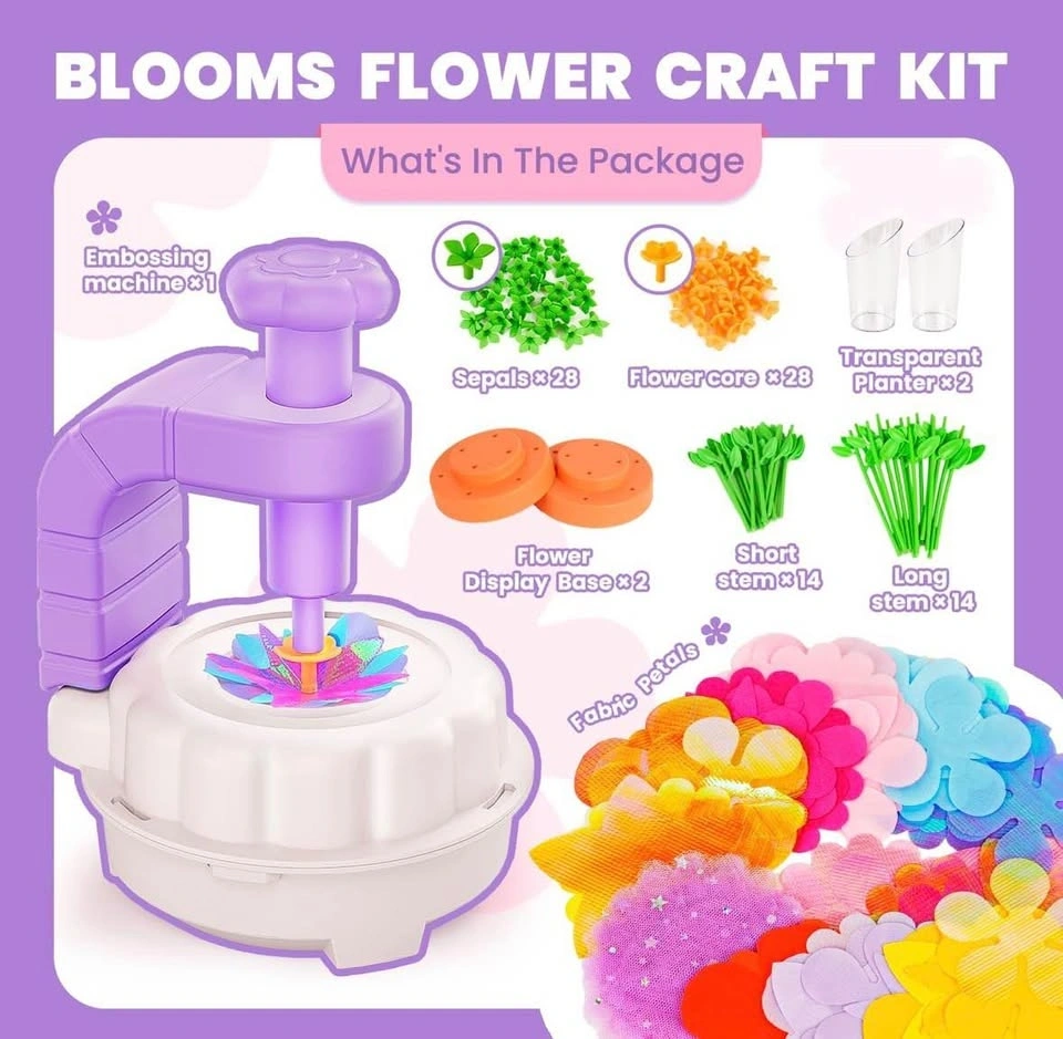 Brand new Fabric Flower Bouquets Toy includes: 1 Embossing machine, 1 Instructions, 28 Sepals, 28 Flower core, 14 Long stem, 14 Short stem, 2 Transparent Planter, 2 Flower Display Base, and a packet of Fabric Petals. Feel free to message if you have any questions!