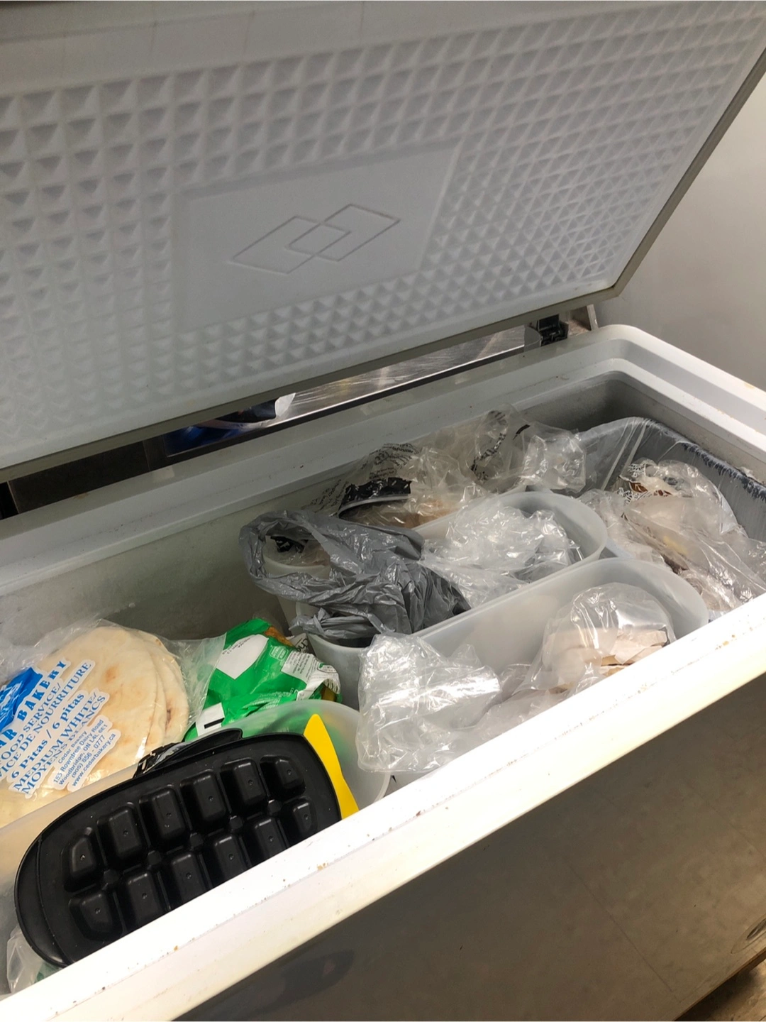 A chest freezer, white in colour. The lid opens up to the contents inside. Controls on the front. This freezer will keep your food fresh for longer.