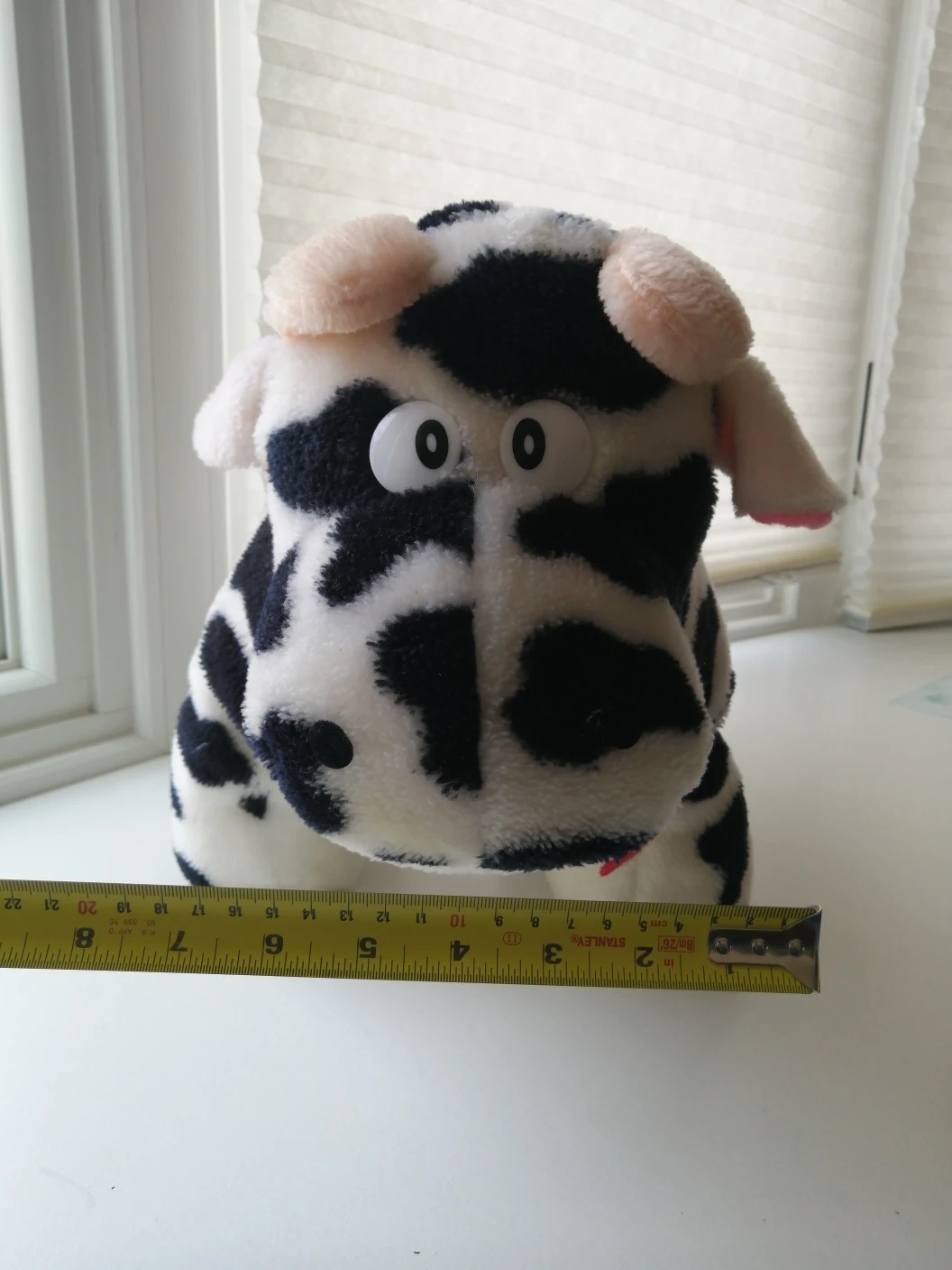 Soft plush cow stuffed animal. It's about 7 inches tall and 13 inches long.