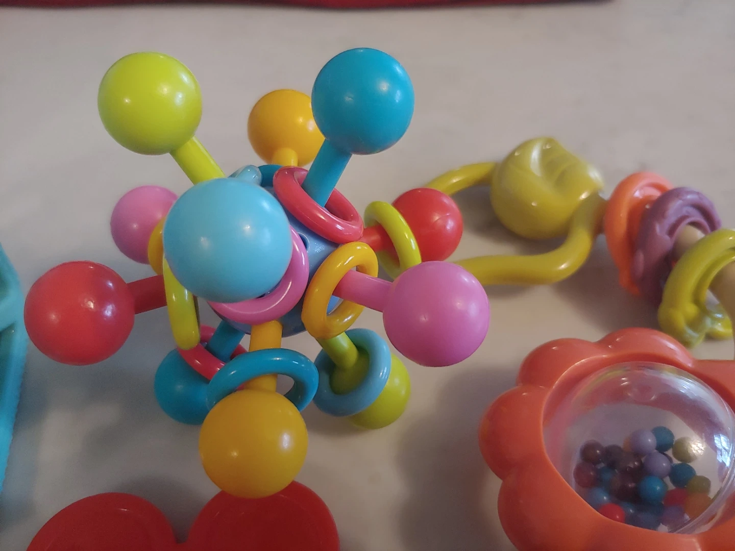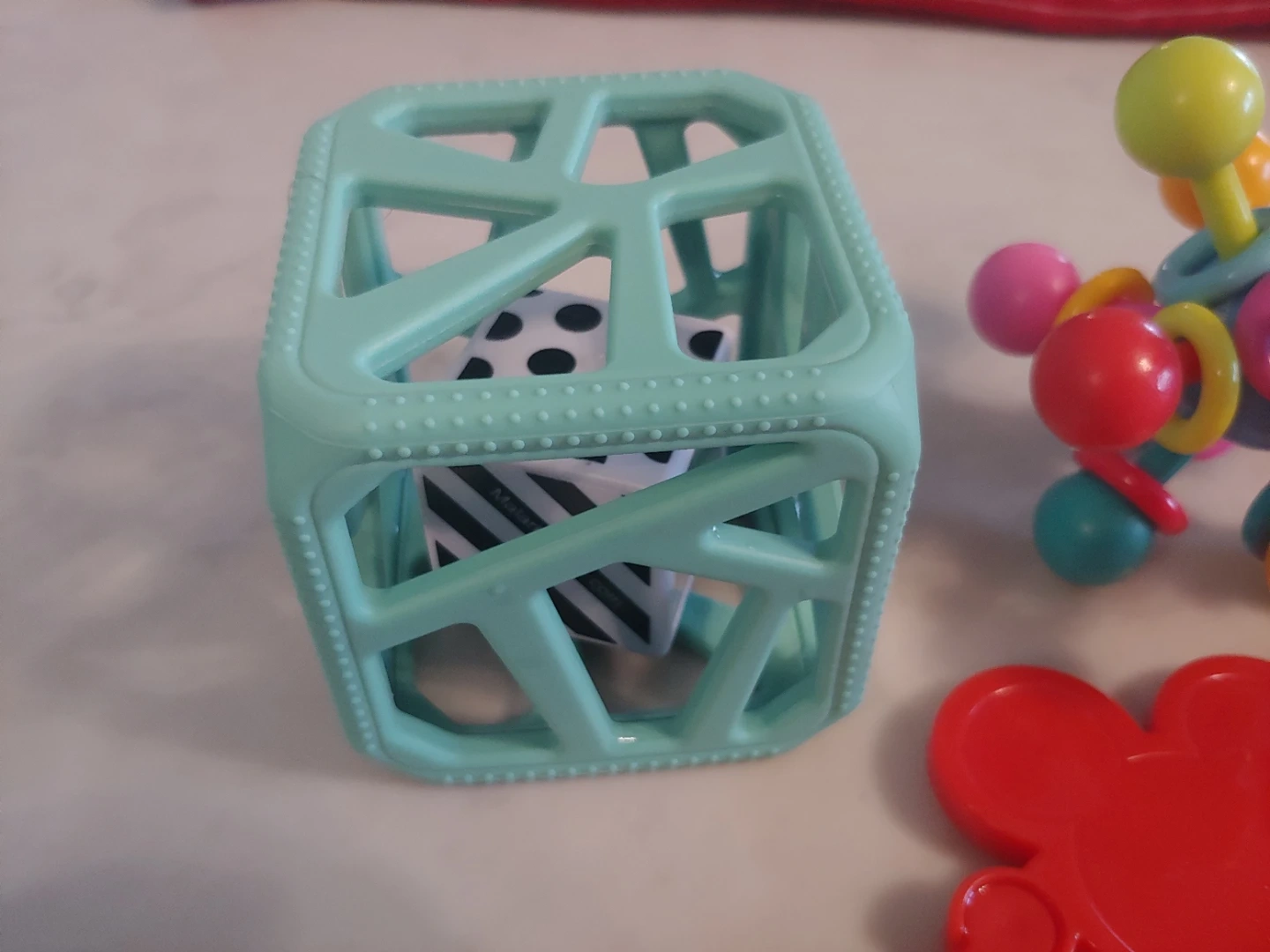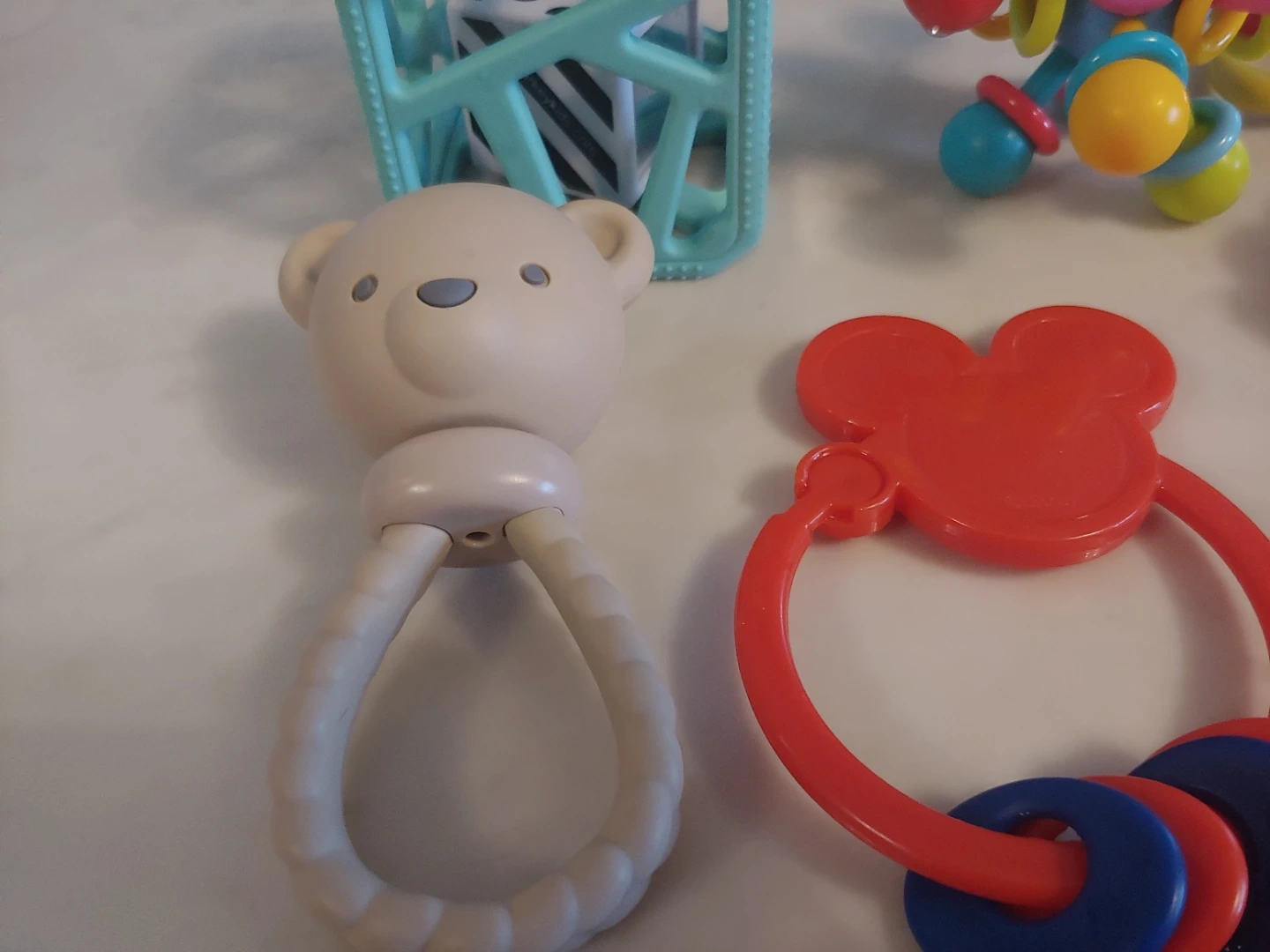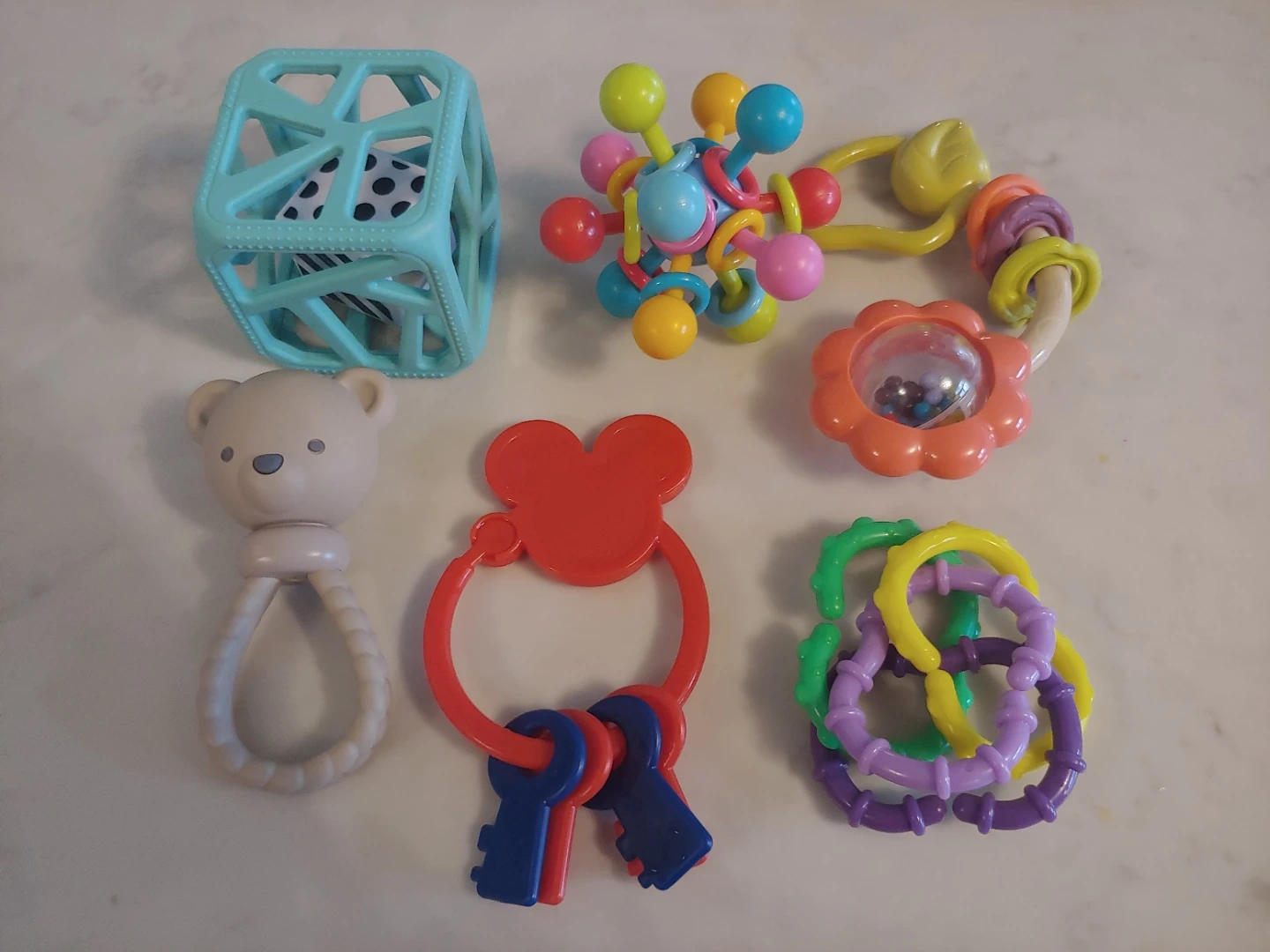 6 piece set of colourful baby toys. Includes a bear rattle, Mickey Mouse keys, a textured cube (retails for 16.99), and an atom teether. Great for sensory play and teething! Hand washed, all in great shape.