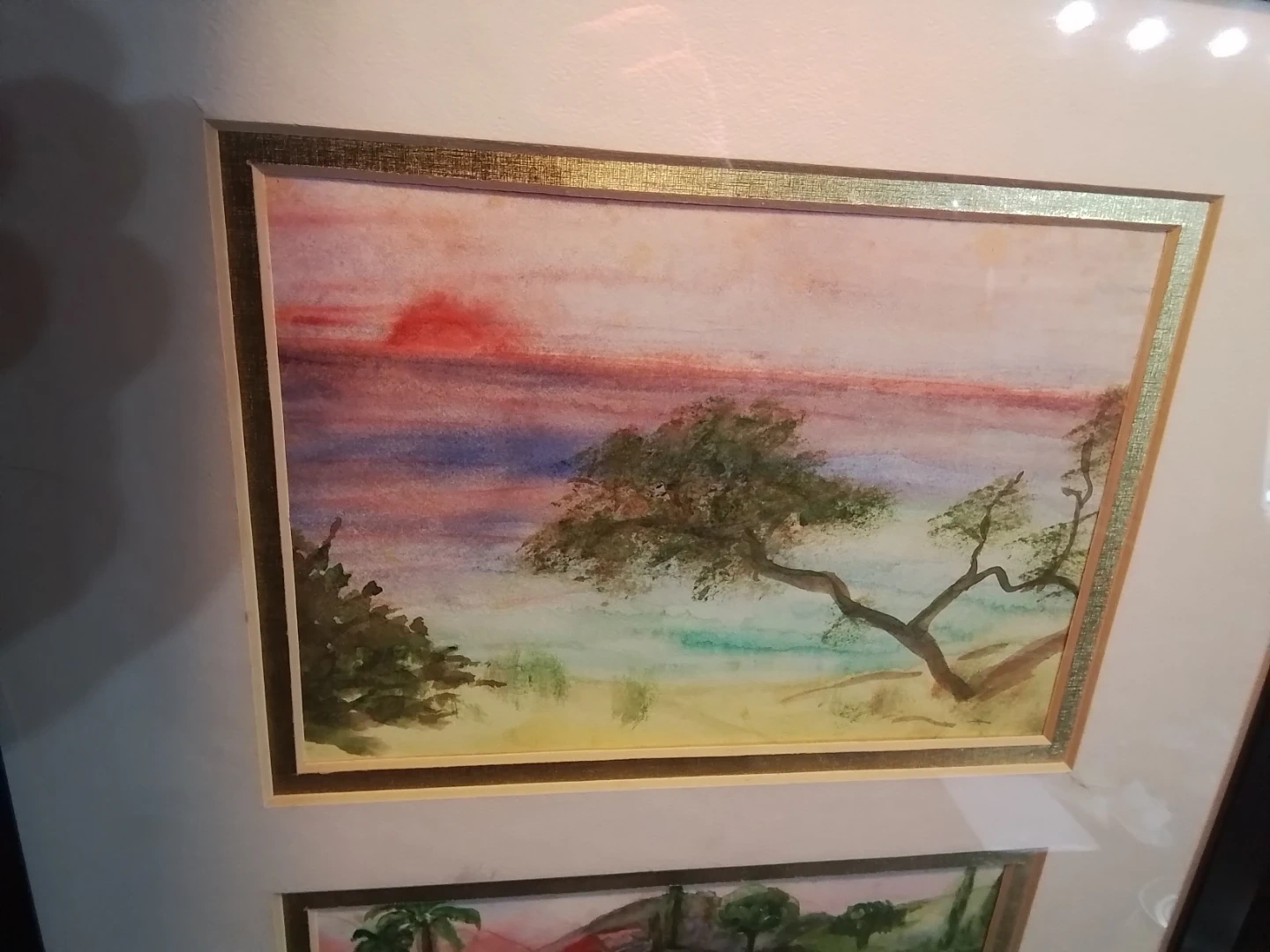 This framed piece features two lovely watercolour paintings, each capturing serene landscapes within a 12x15 inch frame. The artwork is in good condition, showcasing delicate brushwork and soothing colour palettes. The frame is black. This beautiful piece could bring a touch of calm to any room.