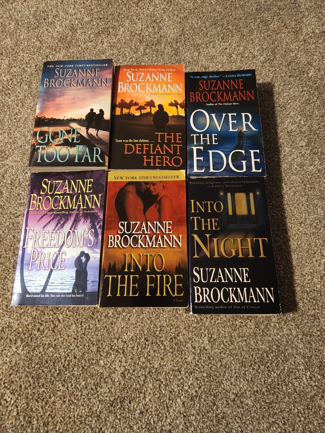 A collection of six New York Times bestselling novels by Suzanne Brockmann. Titles include 'Into The Night', 'Into The Fire', 'Freedom's Price', 'Over The Edge', 'The Defiant Hero', and 'Gone Too Far'. These paperbacks are part of the Troubleshooters series. A great addition for fans of romantic suspense!