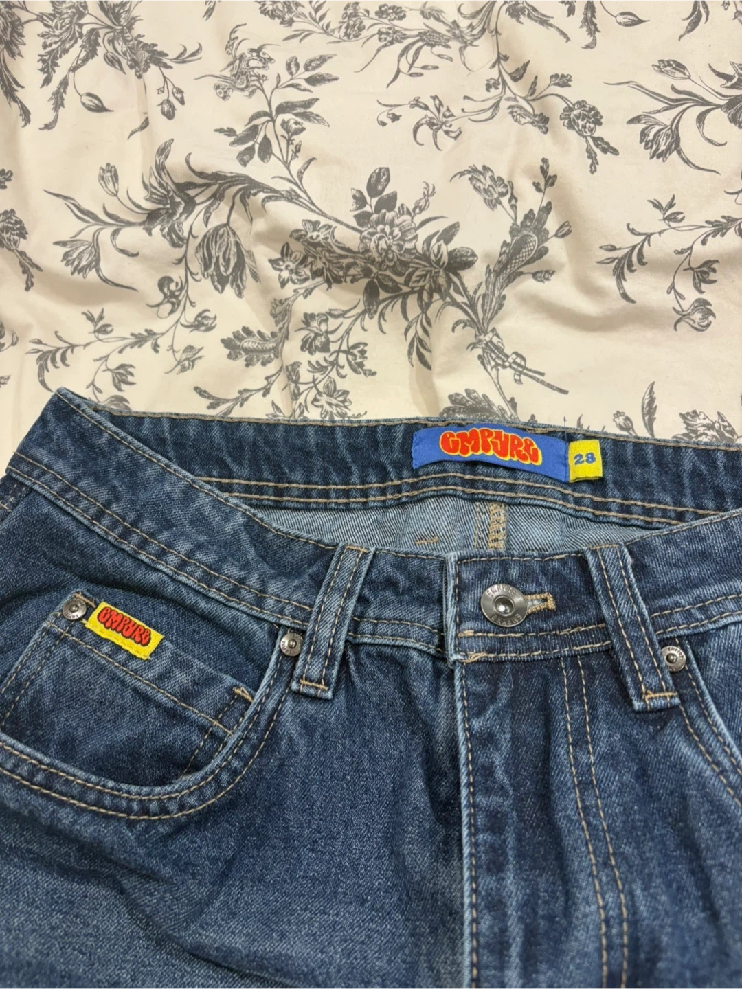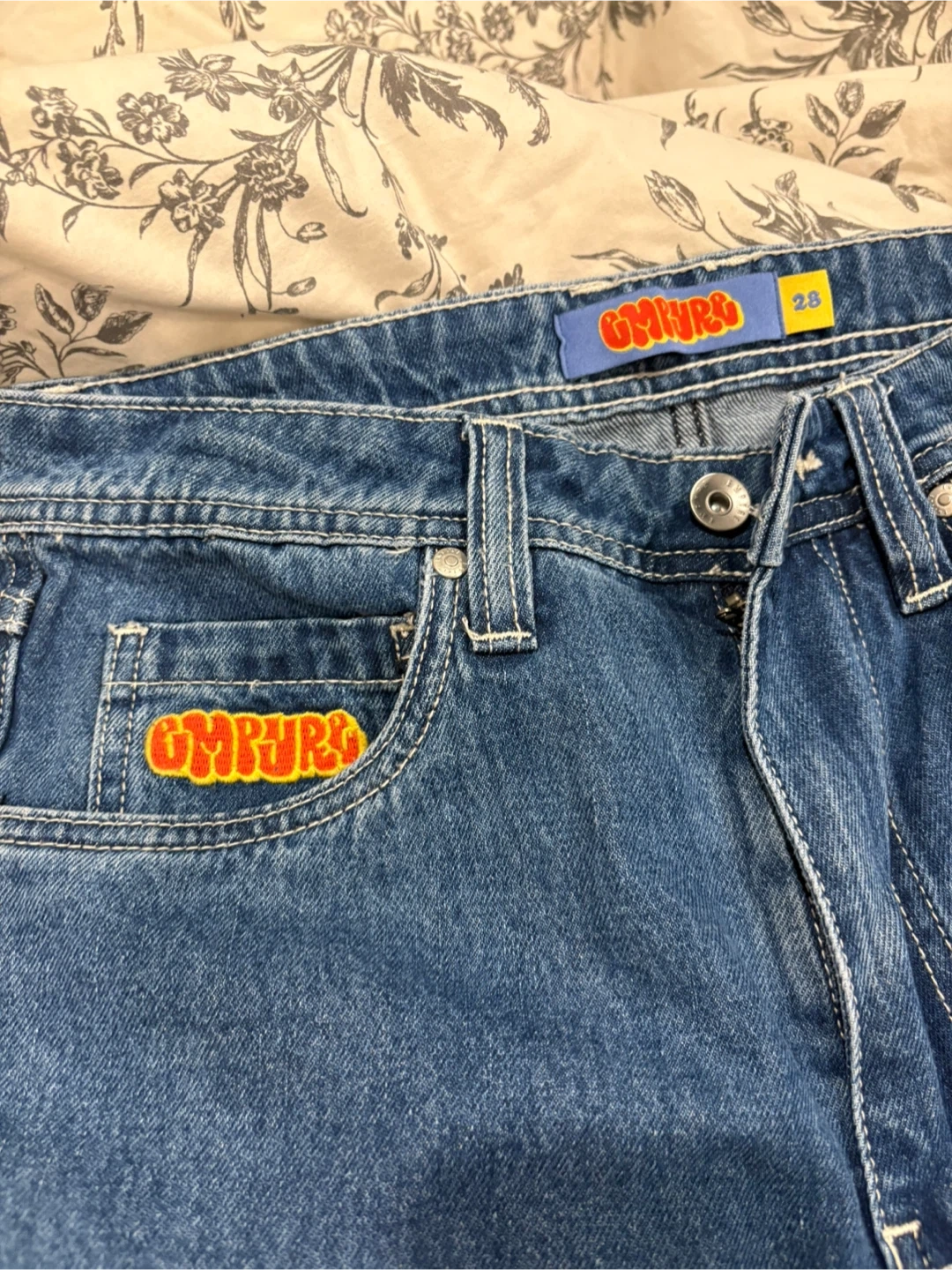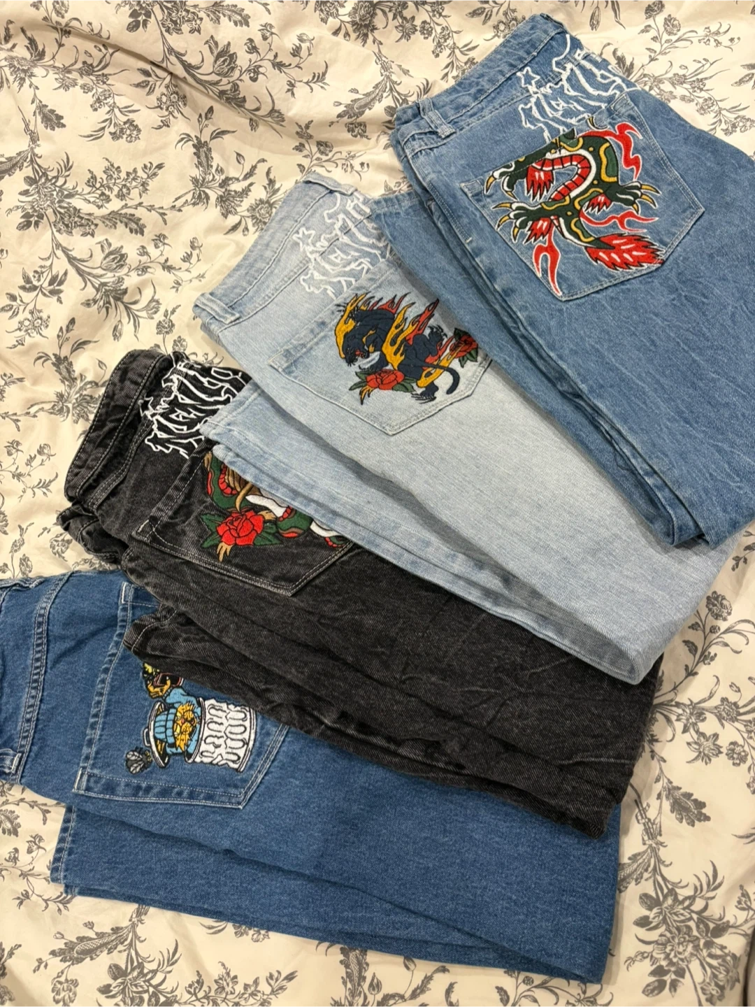 These jeans feature eye-catching embroidered designs on the back pockets, including a dragon, a panther with flames, and a rose motif. They're made of denim and come in various washes. These would be great for adding some flair to your everyday outfits!