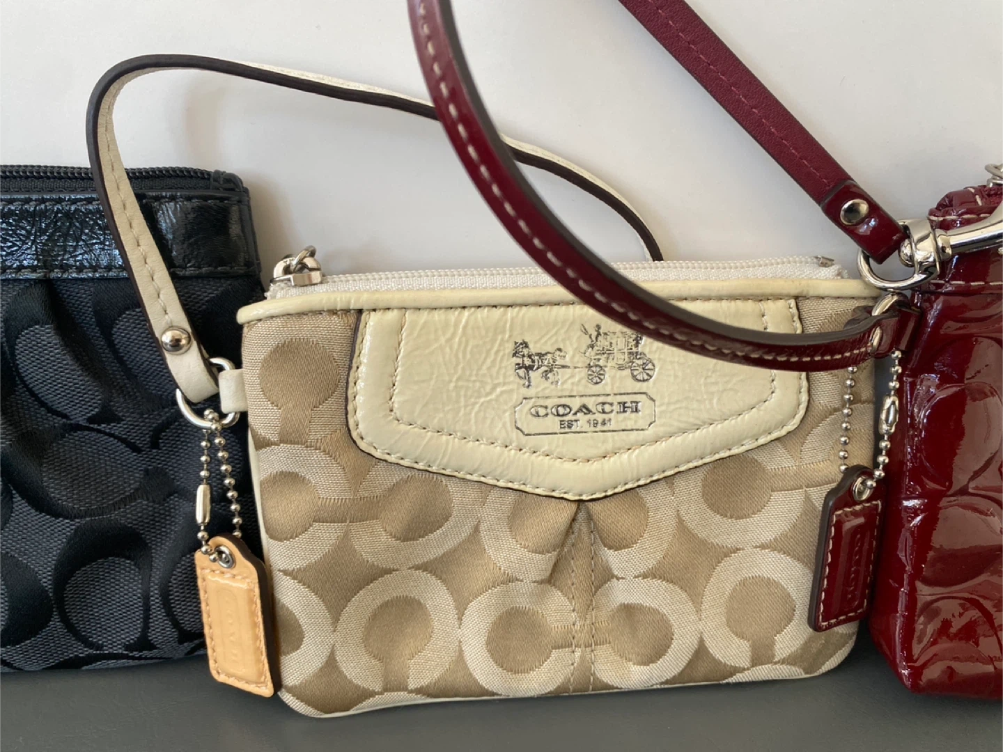 A set of three Coach wristlets. Includes a black fabric wristlet with the signature 'C' pattern, a tan and cream fabric wristlet with a cream leather trim featuring the Coach logo, and a burgundy patent leather wristlet with an embossed signature 'C' pattern. All three have wrist straps and zip closures.