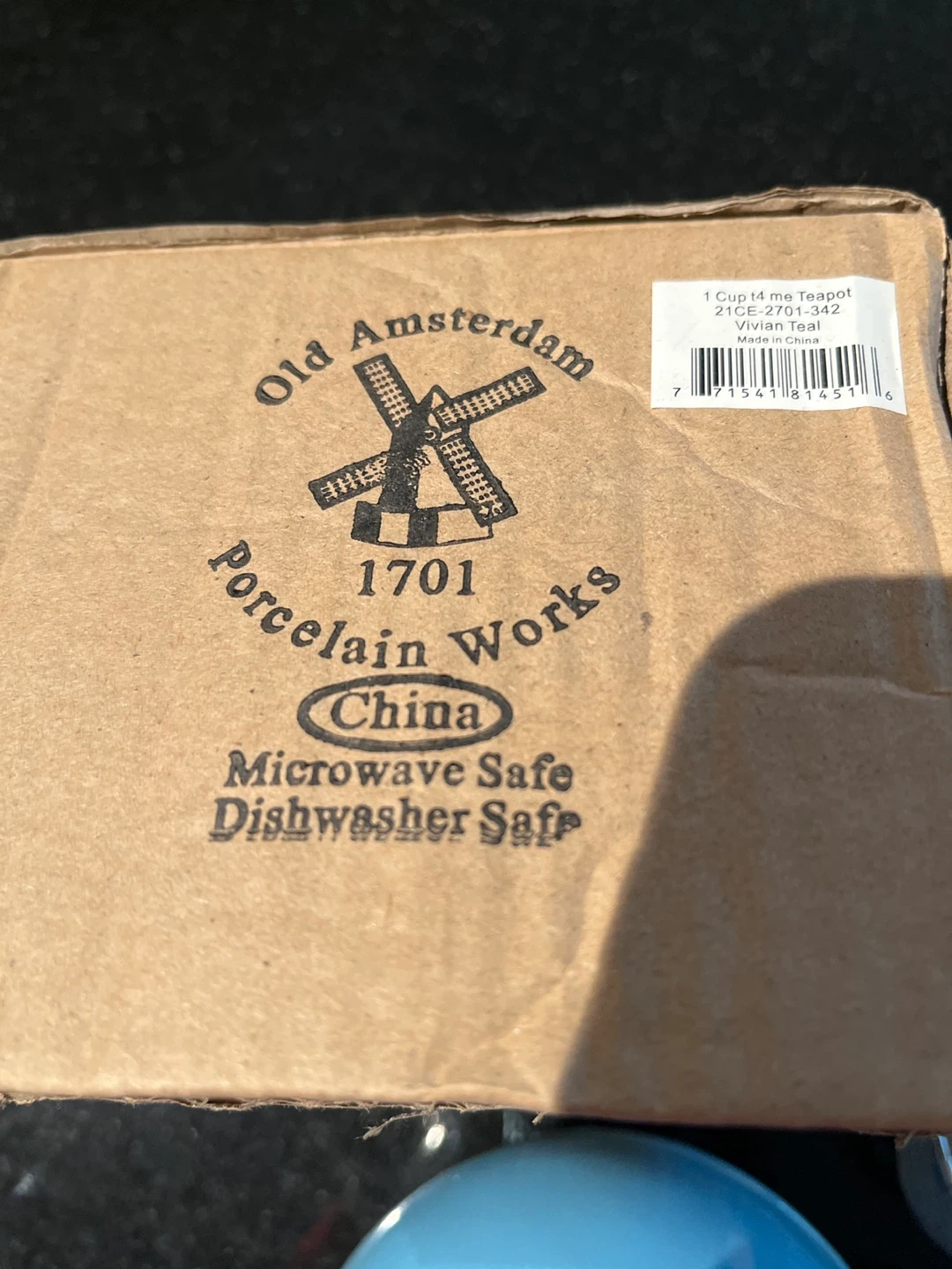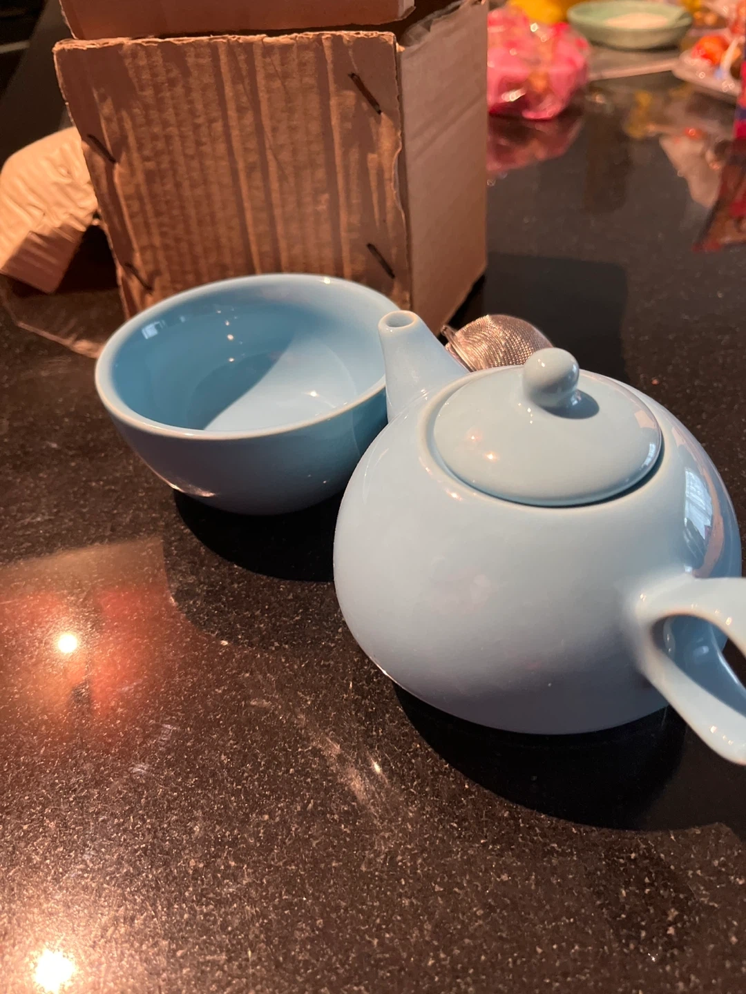 This is a 1 cup teapot set from Old Amsterdam Porcelain Works. It includes a teapot, a cup, and a tea infuser. The set is microwave and dishwasher safe. It's great for enjoying a single serving of tea!