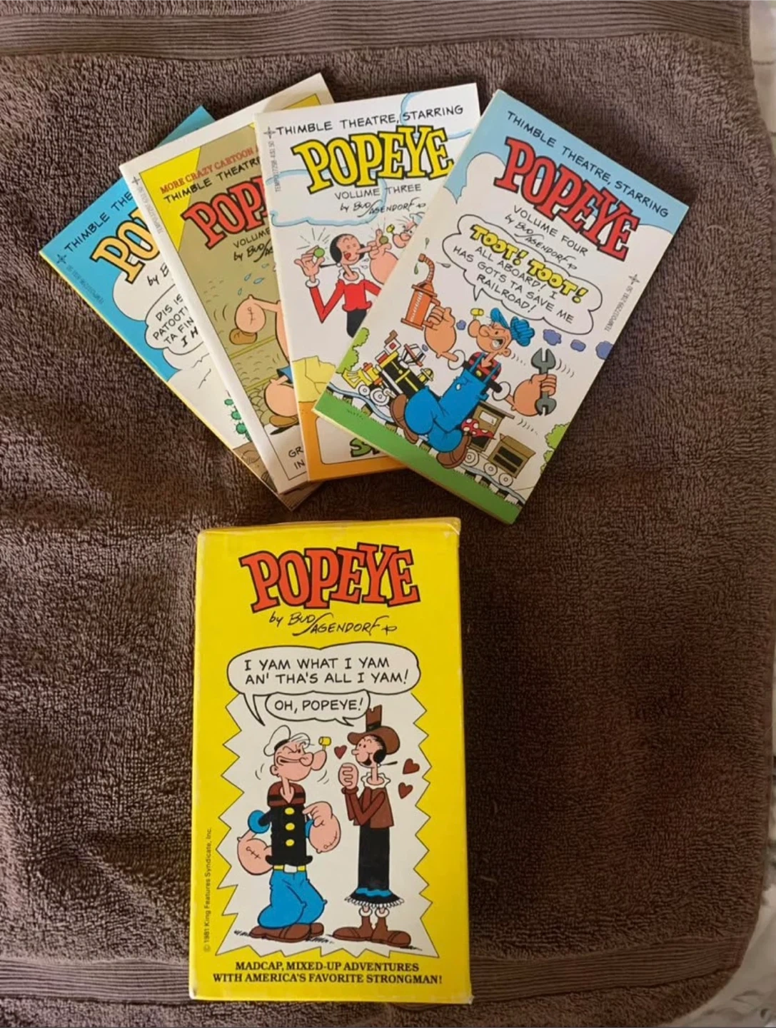 This collection includes Popeye comic books, specifically Volumes 1, 2, 3, and 4 of the Thimble Theatre series. These books contain madcap adventures with America's favorite strongman. Copyright 1981.