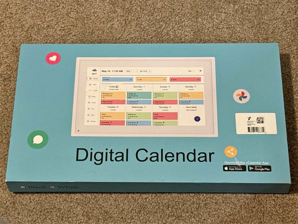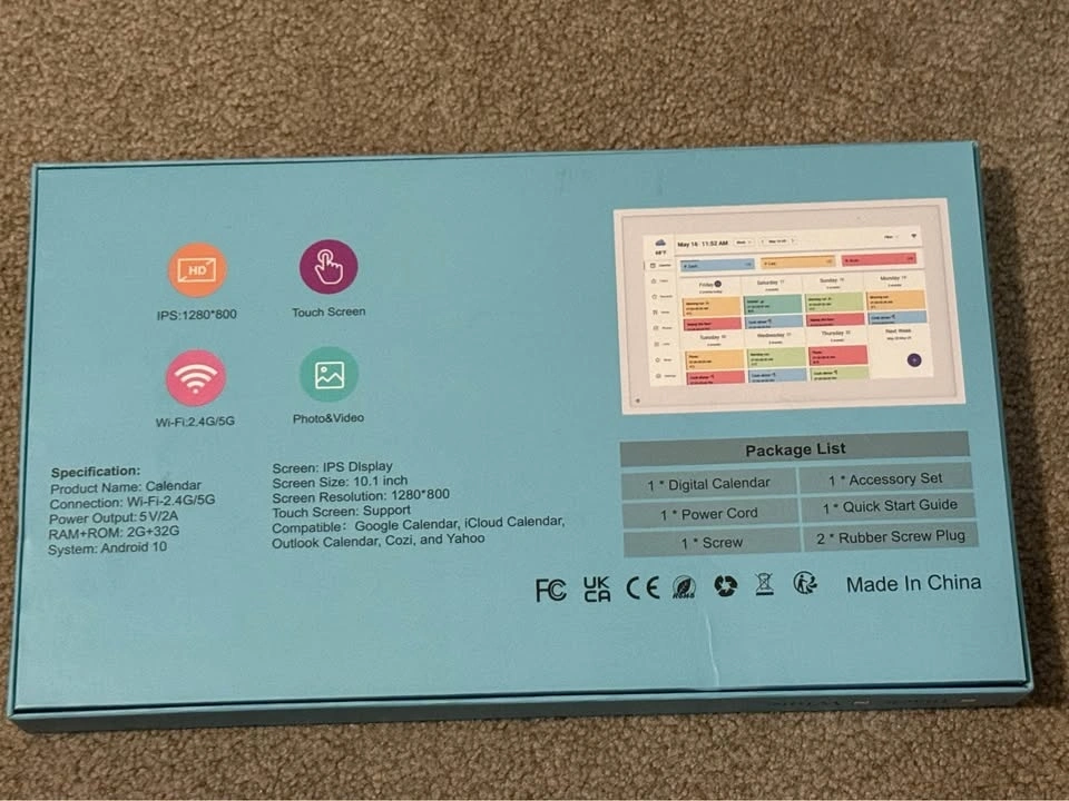 New digital calendar with a 10.1 inch IPS touch screen. Connects with Wi-Fi 2.4G/5G. Runs on Android 10 with 2G RAM and 32G ROM. Compatible with Google Calendar, iCloud Calendar, Outlook Calendar, Cozi, and Yahoo.