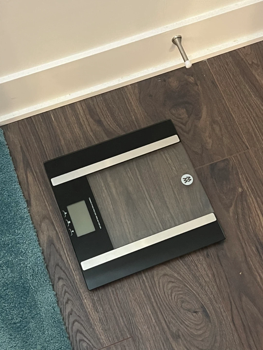 Digital weight scale with a stylish glass surface and black accents. It features a clear LCD display for easy reading. This scale is designed to help you track your weight.