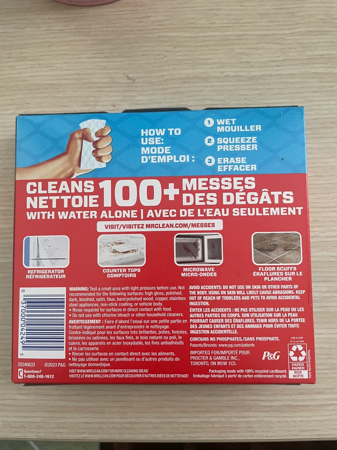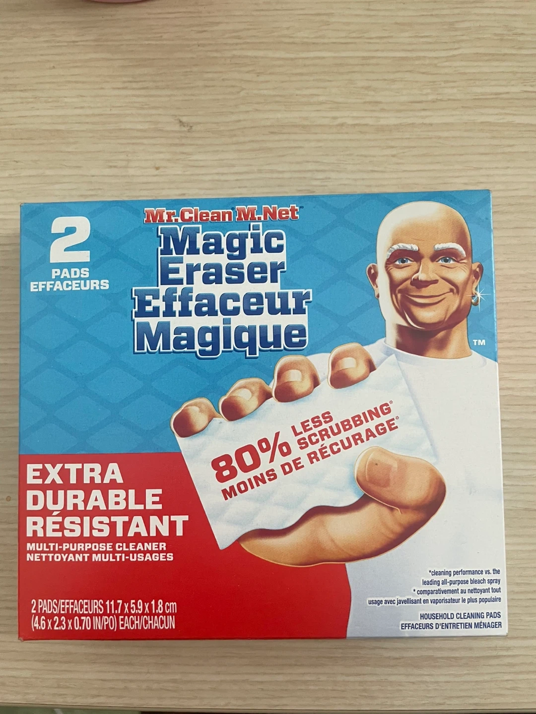 Mr. Clean Magic Eraser comes in a pack of 2 extra durable cleaning pads. These multi-purpose cleaner pads tackle tough messes and provide 80% less scrubbing. Each pad measures 11.7 x 5.9 x 1.8 cm.