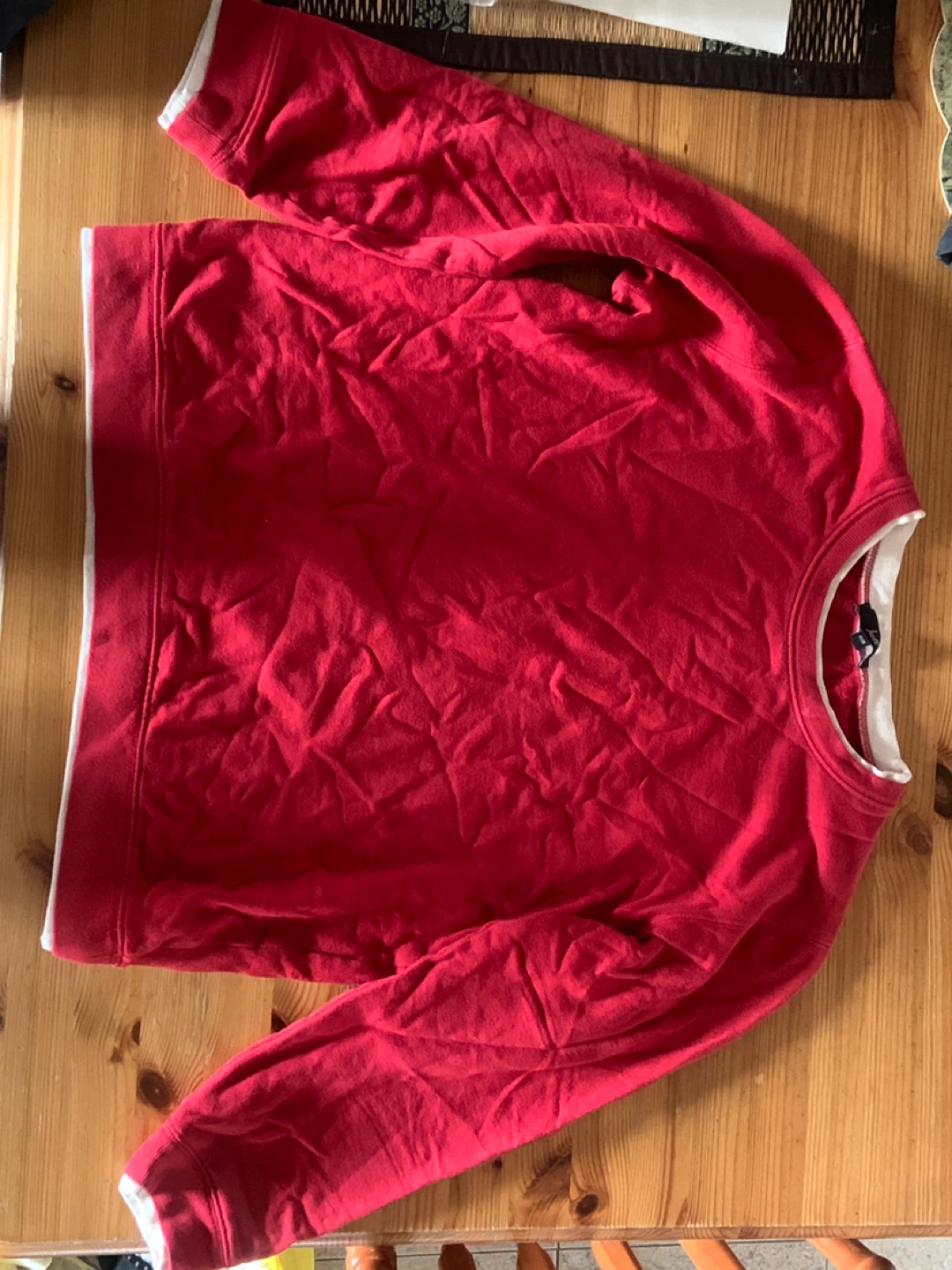 This is a red crew neck sweatshirt. It's made of a soft cotton blend. Perfect for layering during cooler weather!