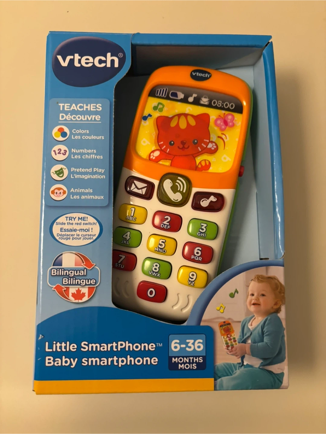 Selling a VTech Little SmartPhone Baby Smartphone, perfect for little ones aged 6-36 months! This bilingual toy teaches colours, numbers, pretend play, and animals. It's a fun and educational toy for your baby!
