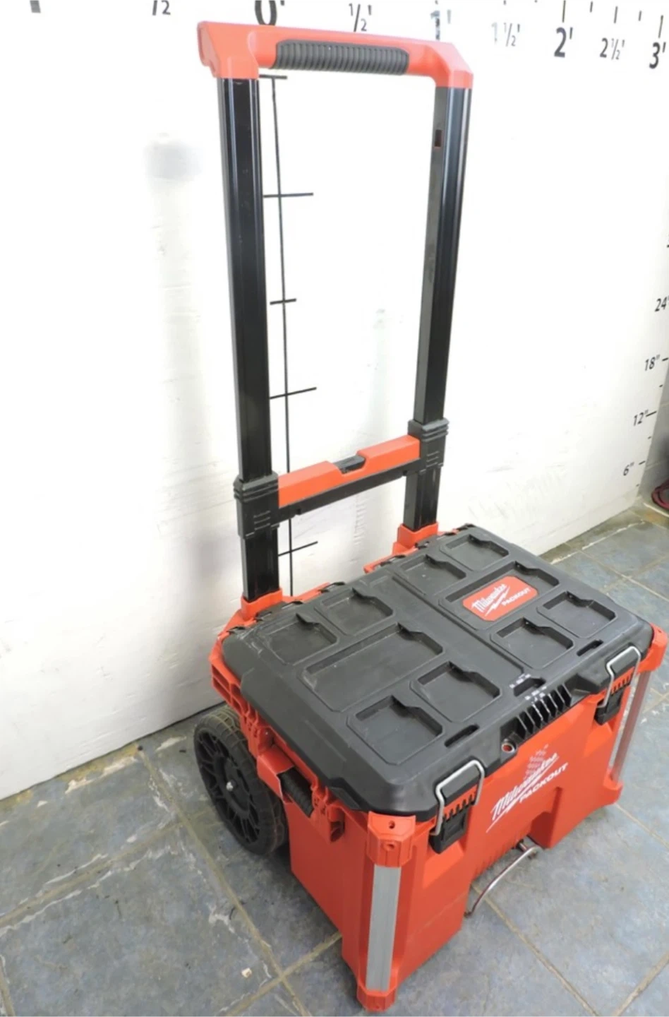 Milwaukee PACKOUT rolling tool chest. It's red and black plastic construction with wheels and an extendable handle. This storage box is designed for durability and easy transport of tools and equipment.