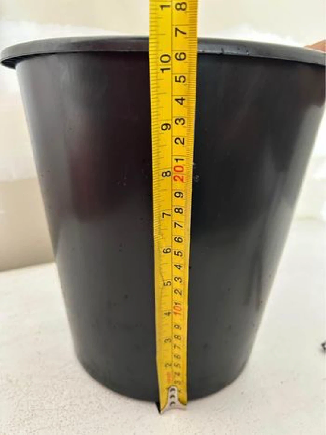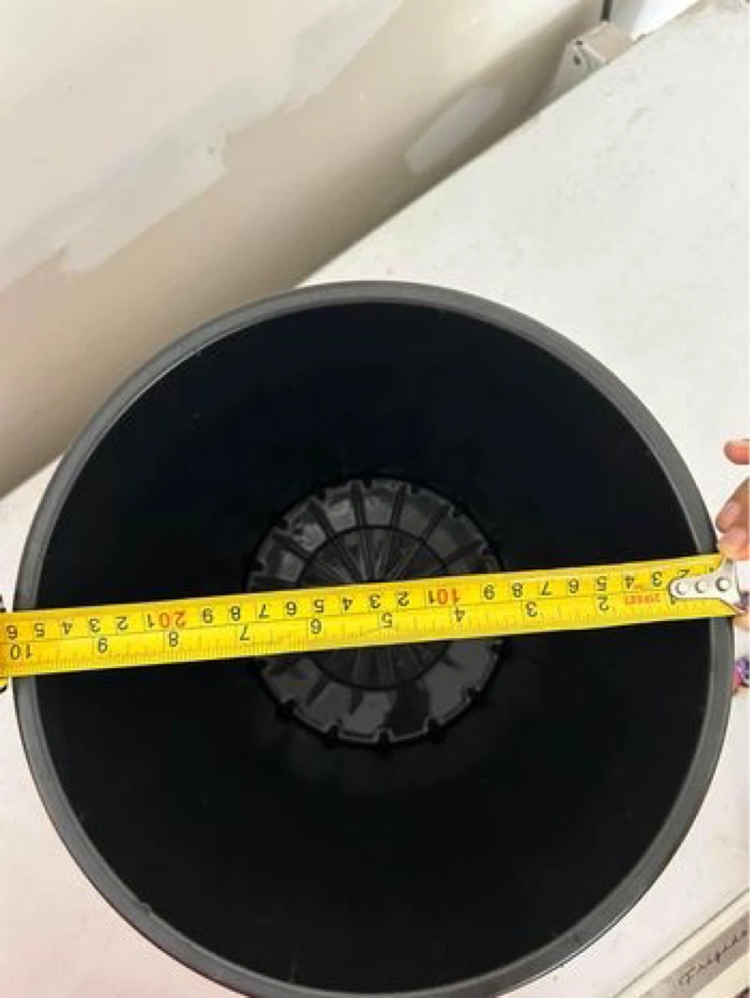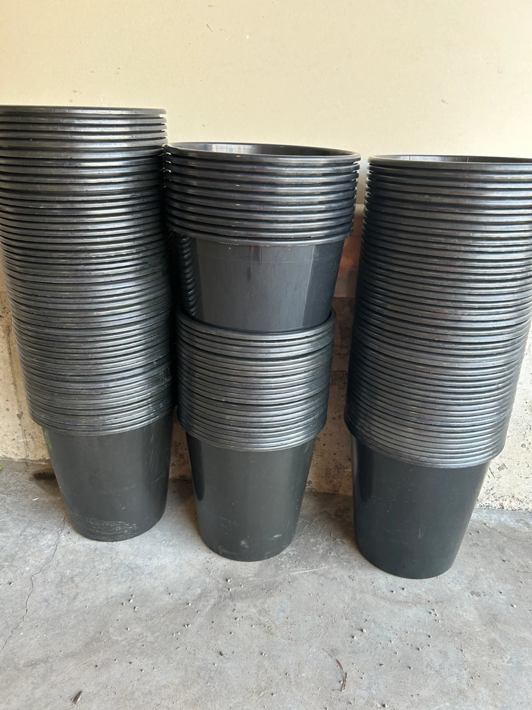 This is a set of black plastic planter pots. They are made of durable plastic. The pots have a diameter of approximately 10 inches and a height of 10"inches. These are great for starting seedlings planting,or for houseplants.