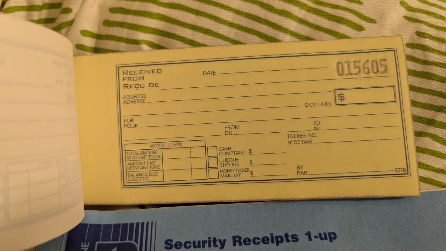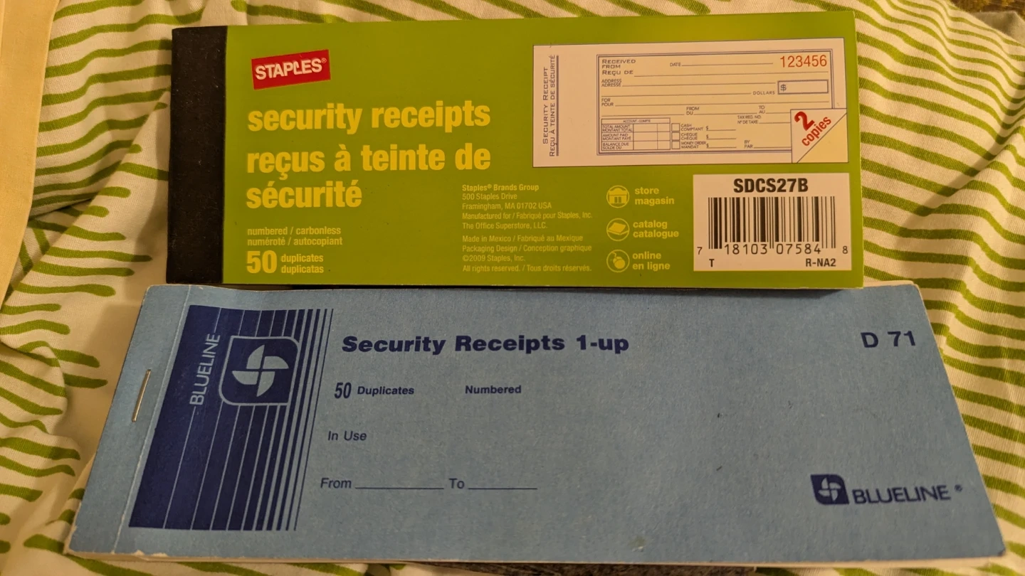 Book of 50 numbered carbonless duplicates. Security receipts for recording transactions. Includes fields for received from, date, amount, and tax registration number.
