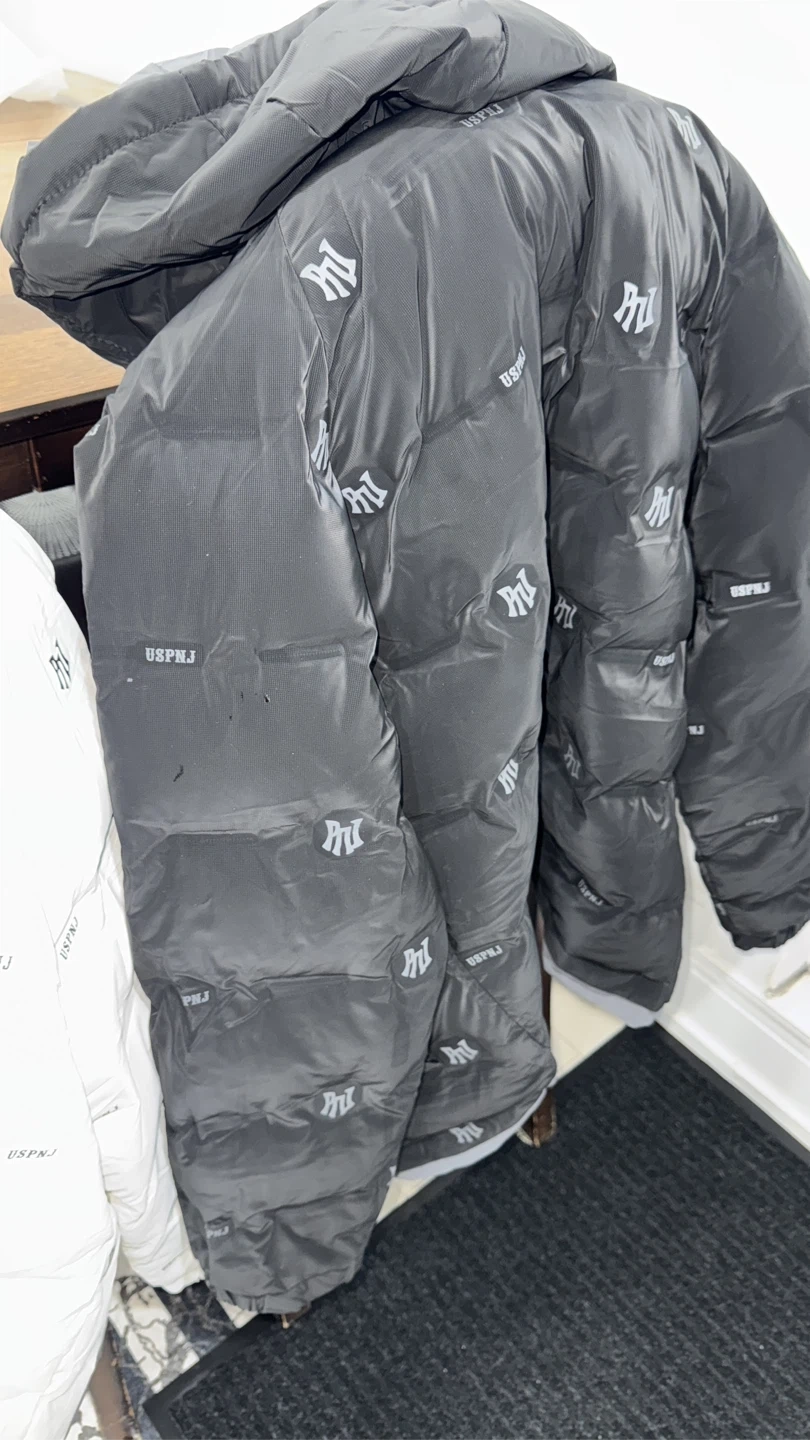 Dark grey puffer jacket with a repeating USPNJ logo pattern. It's a warm, insulated coat perfect for colder weather. Material is polyester.