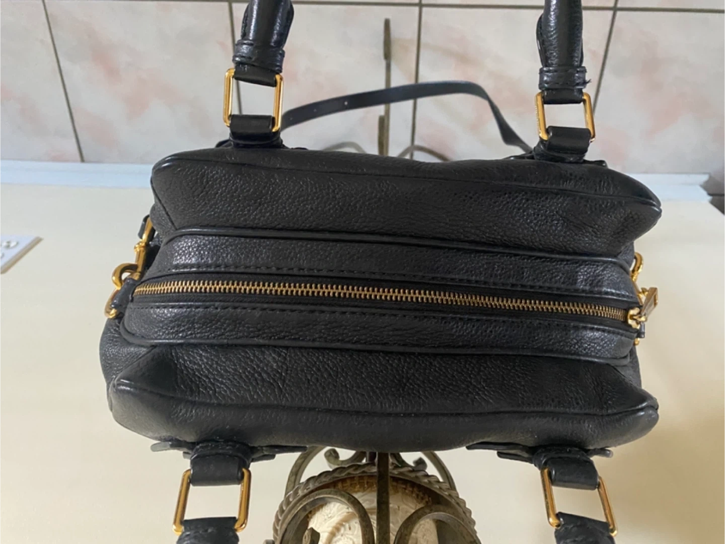 Classic structured “bowling bag” style in soft black pebbled leather with gold-tone hardware. Timeless, versatile, and perfect for everyday use.