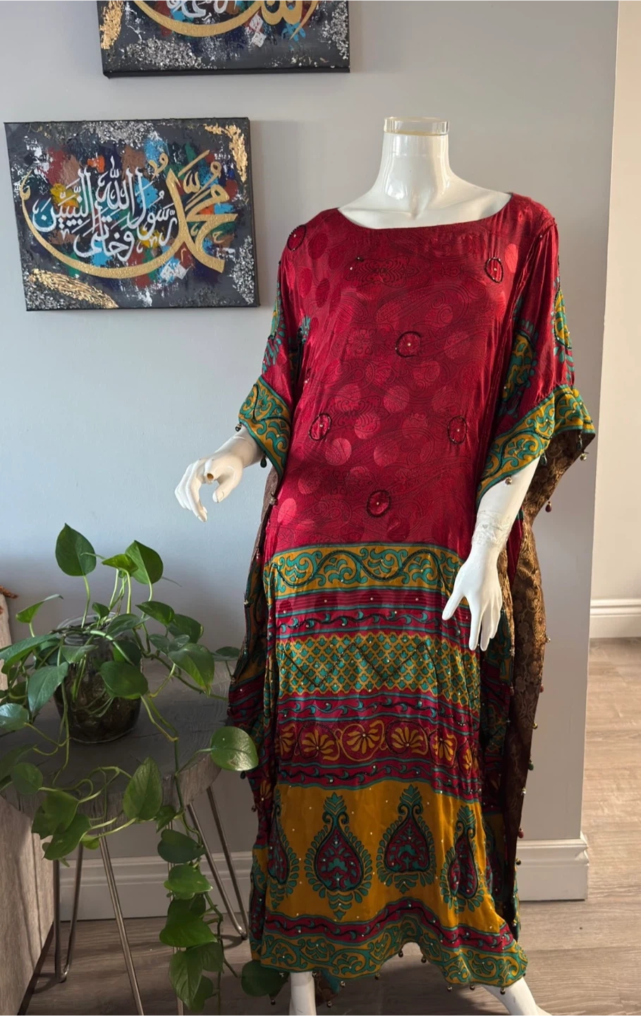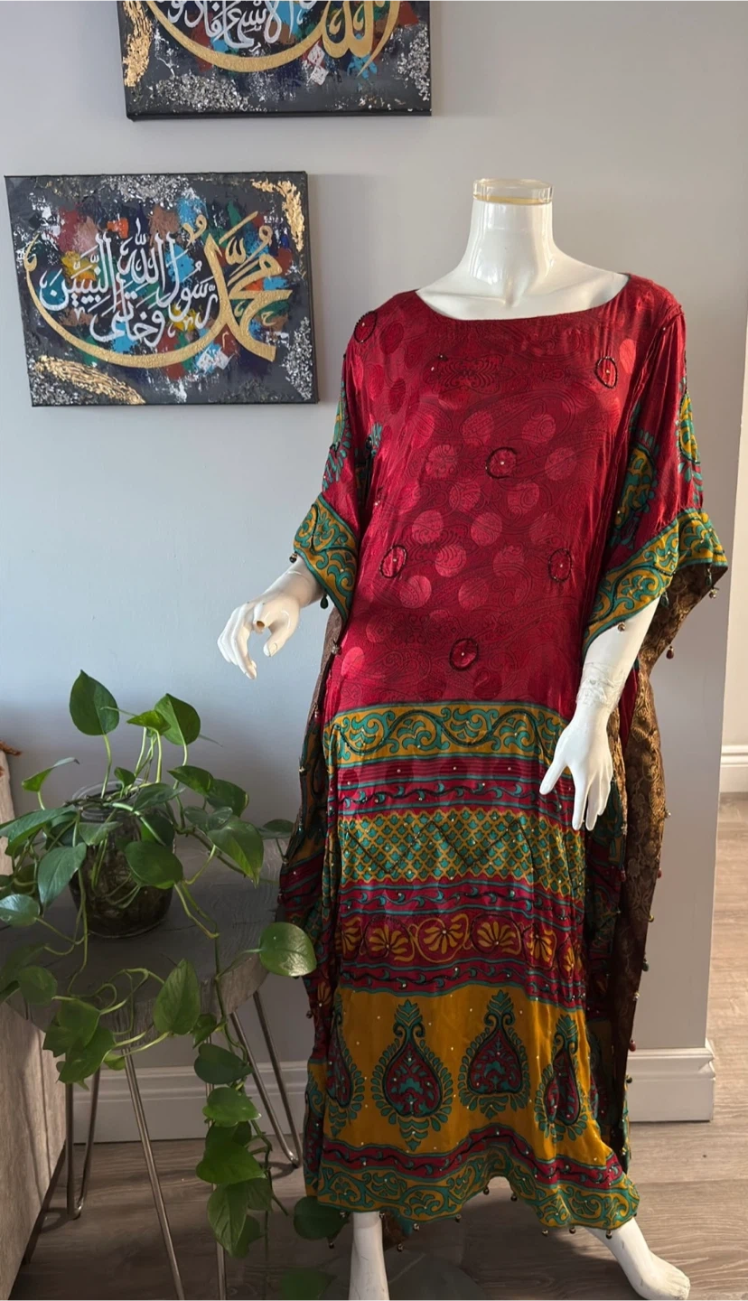 This vibrant kaftan features a flowing silhouette with a colourful, patterned design. It has a wide neckline and wide sleeves adorned with small beads. The materials silk lightweight. Medium to large size