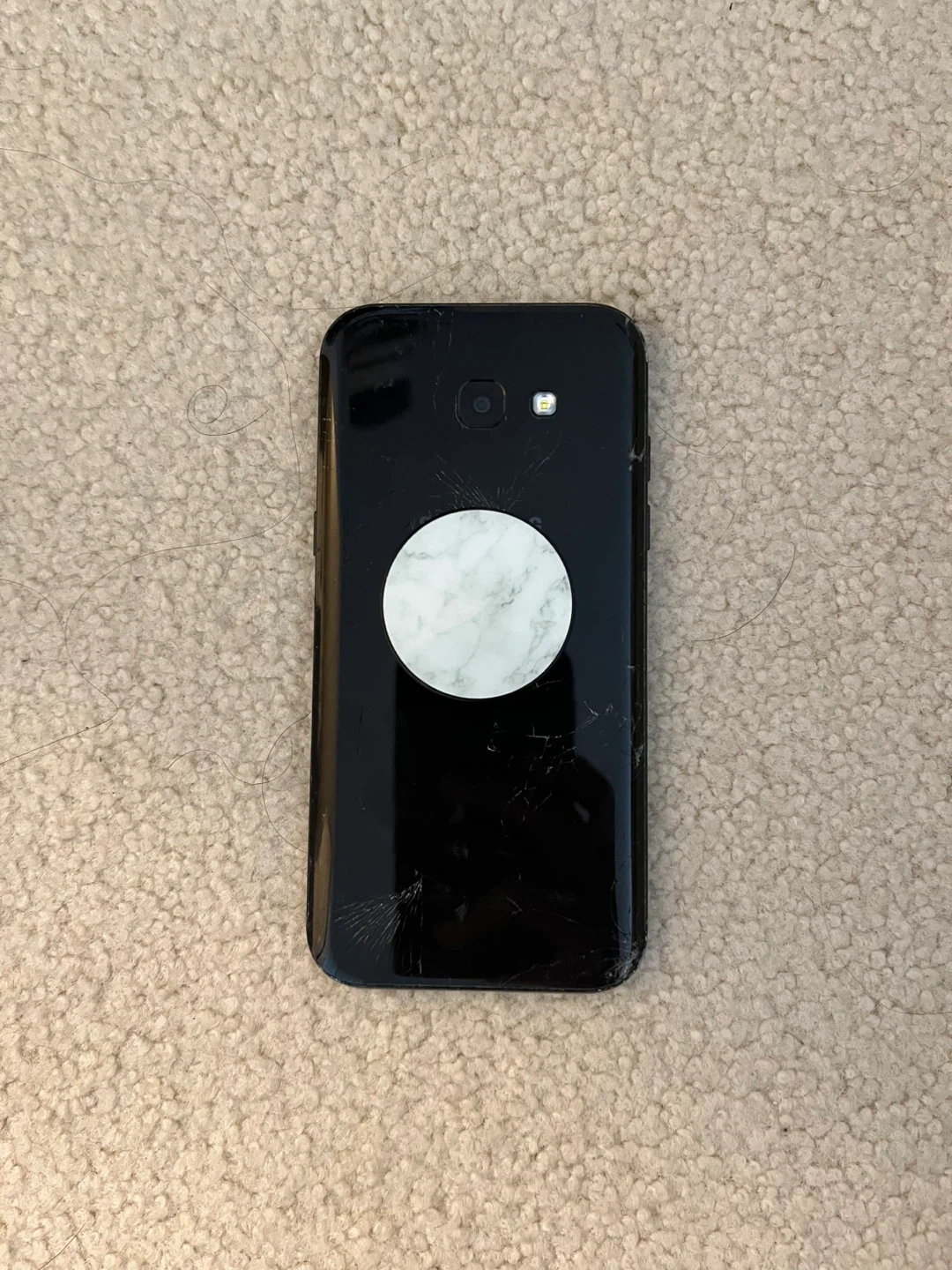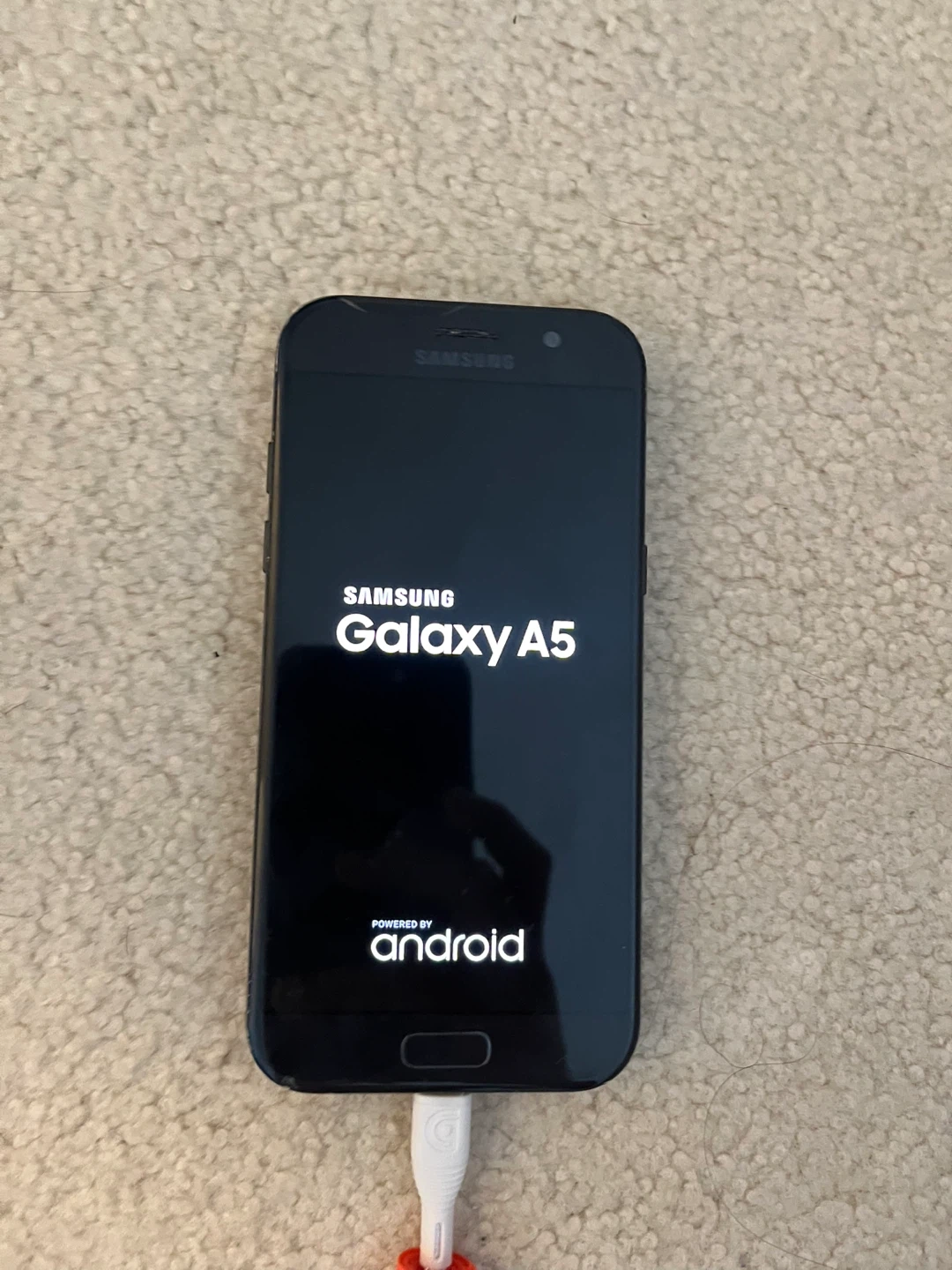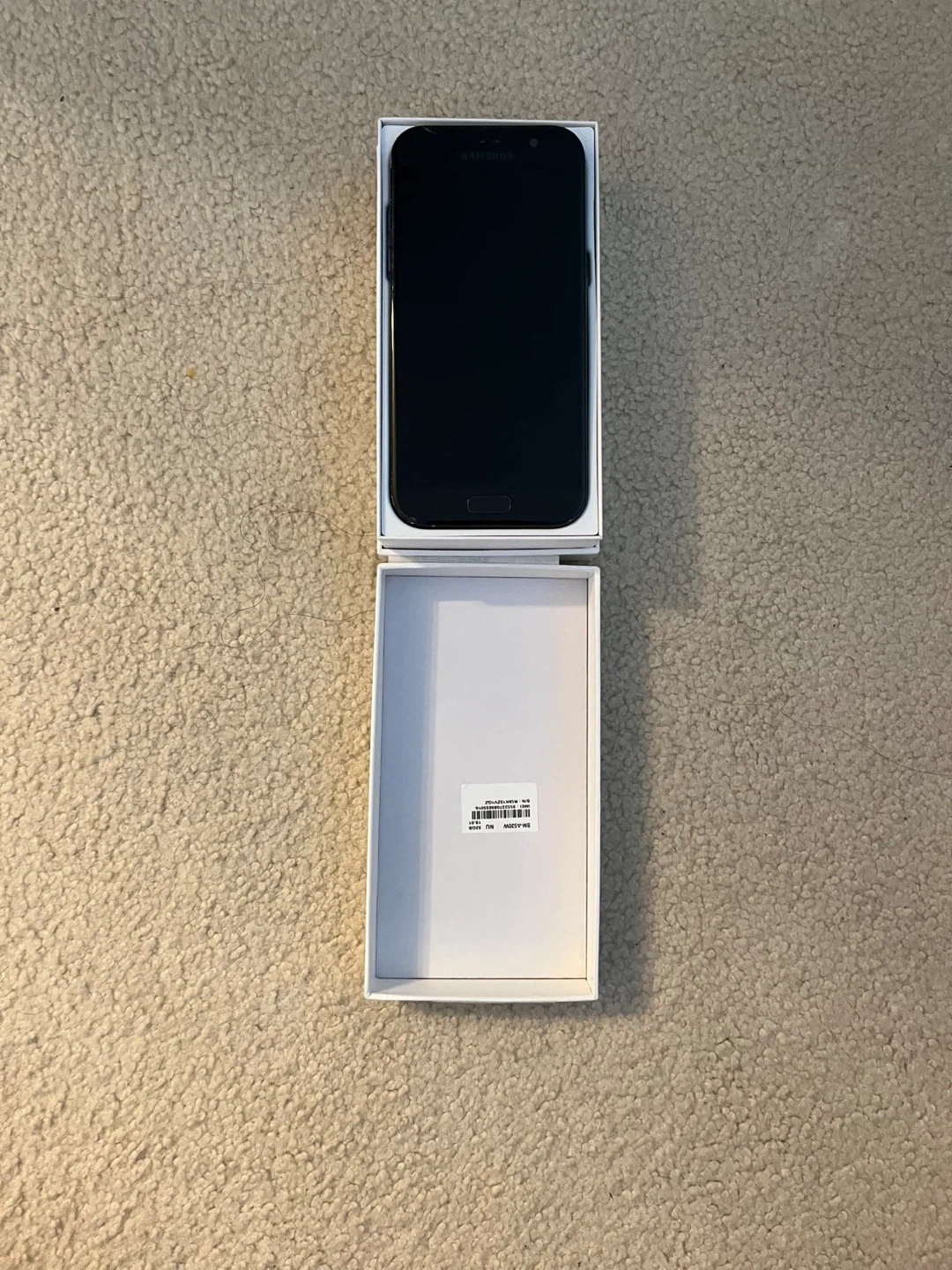 This is a Samsung Galaxy A5 smartphone. It's a black model. The original box is included. The back is cracked but the phone still works just like new