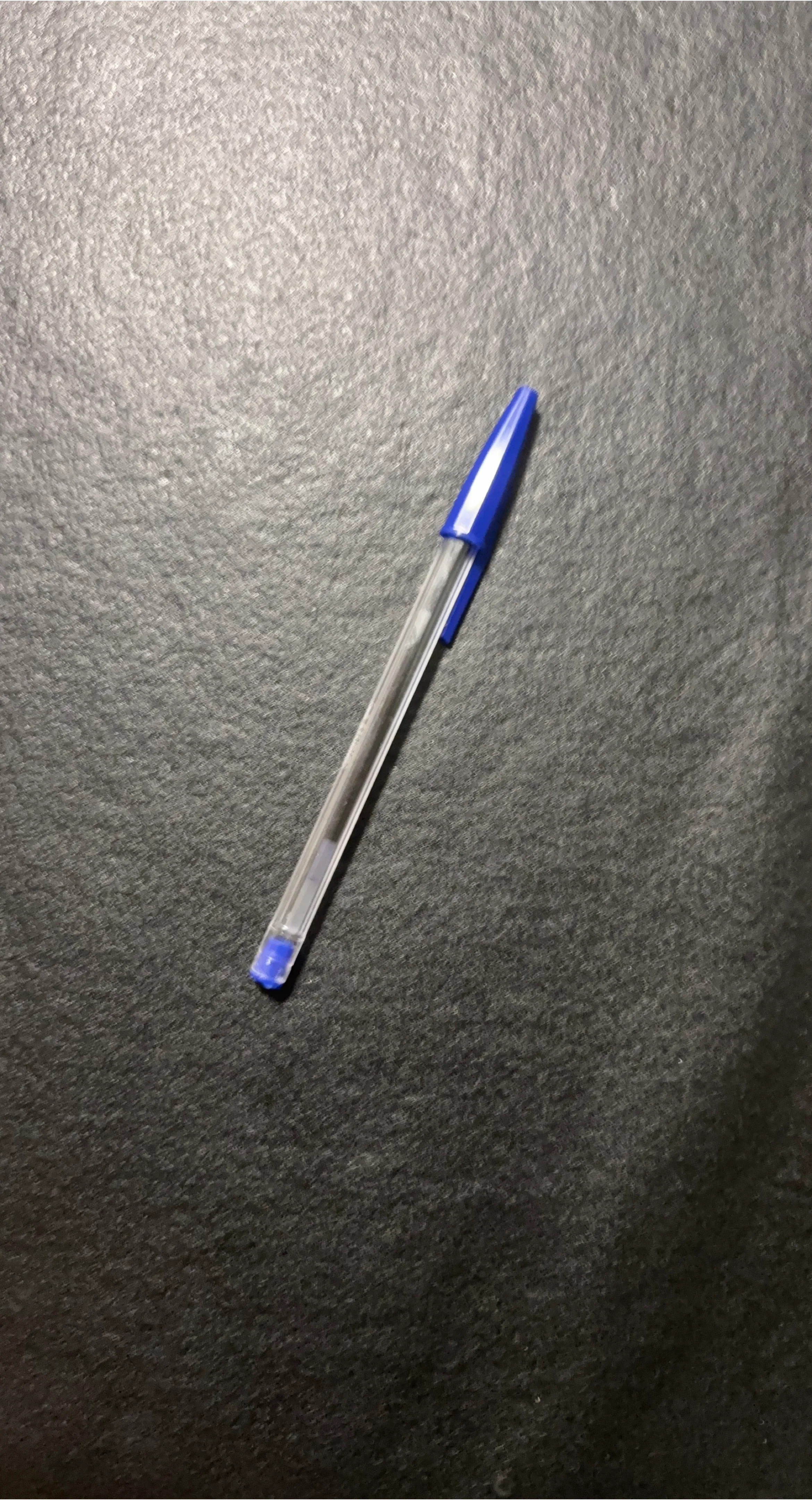 This is a classic Bic pen with blue ink. It's a reliable choice for everyday writing. The transparent barrel lets you see the ink level. Great for quick notes and signing documents!