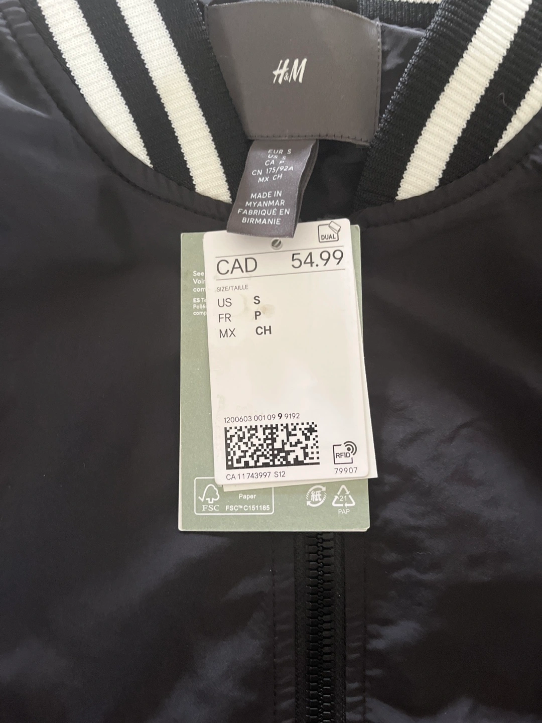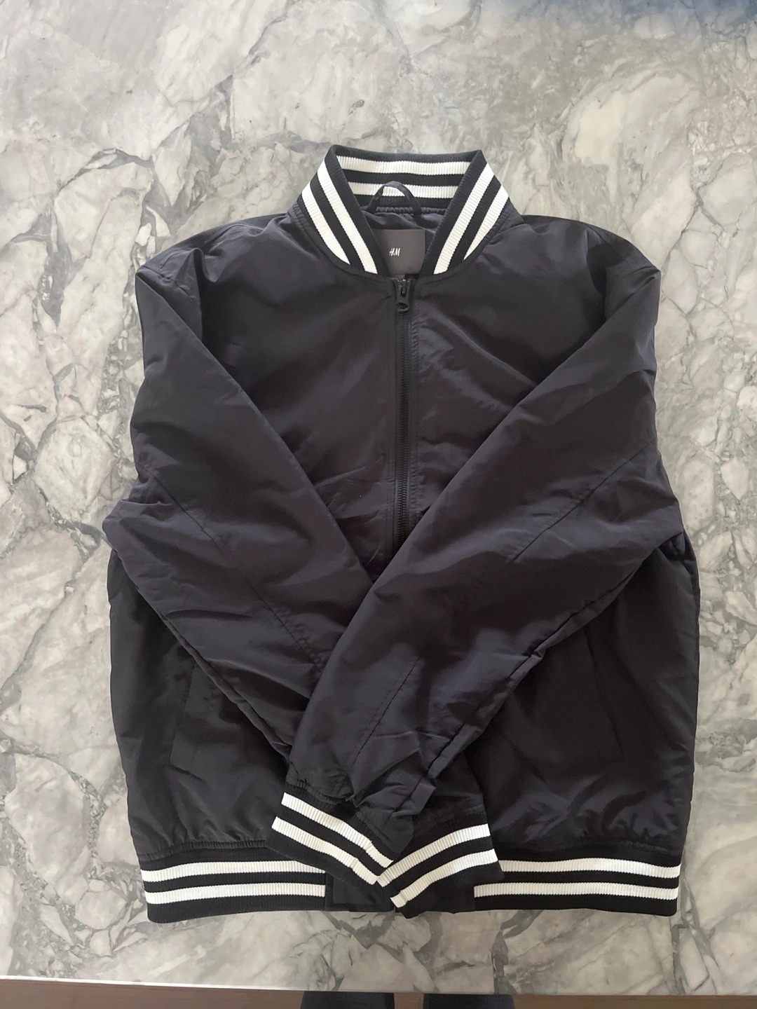 Selling a stylish H&M bomber jacket in black! It's a size men’s small and features a classic bomber design with striped detailing on the collar, cuffs, and hem. Originally bought for $54.99 CAD. Never worn. Perfect for layering and adding a cool touch to any outfit