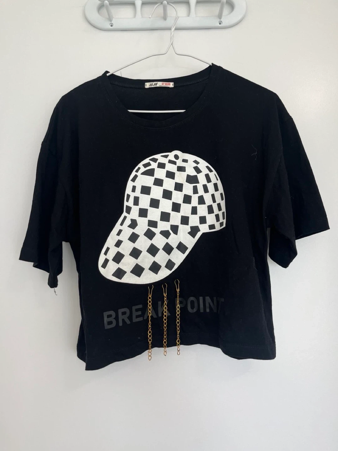 10Here's a cute H&M black t-shirt! It features a graphic of a checkered hat and the word "BREAKPOINT" with chain details. It's in great condition and ready for a new home!