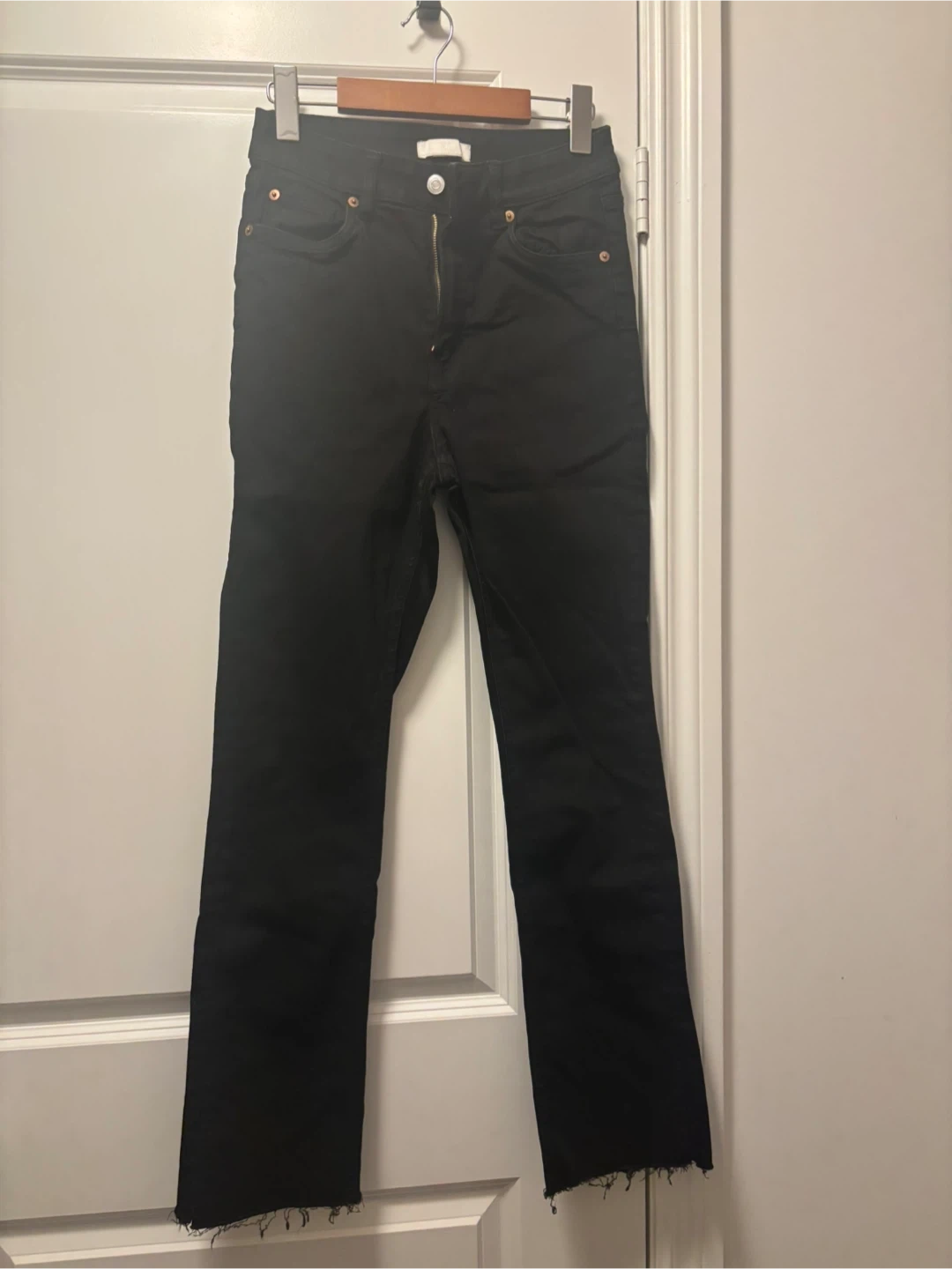 112Selling a pair of H&M black high-waisted skinny jeans. They're in great condition and have a stylish, slightly frayed hem, and side splits. Perfect for any casual outfit!