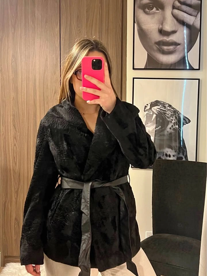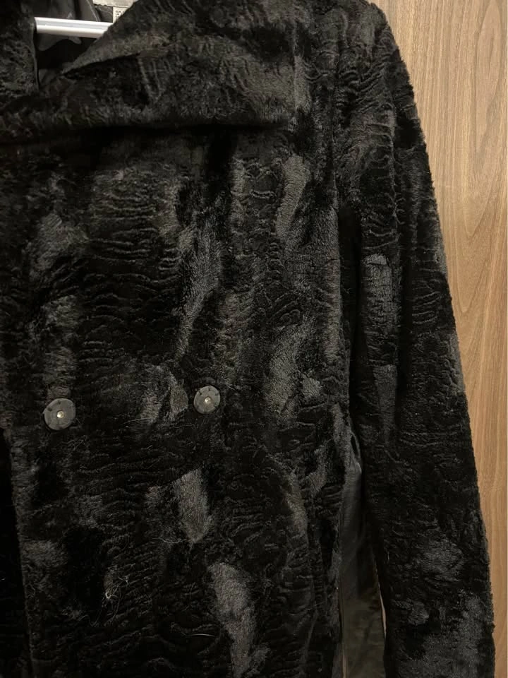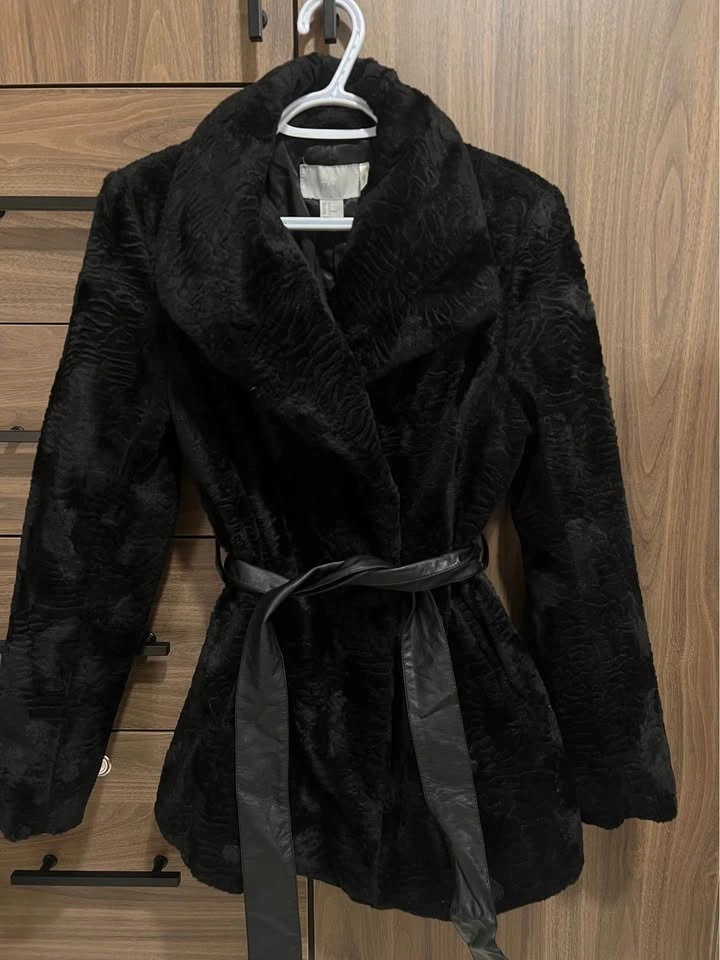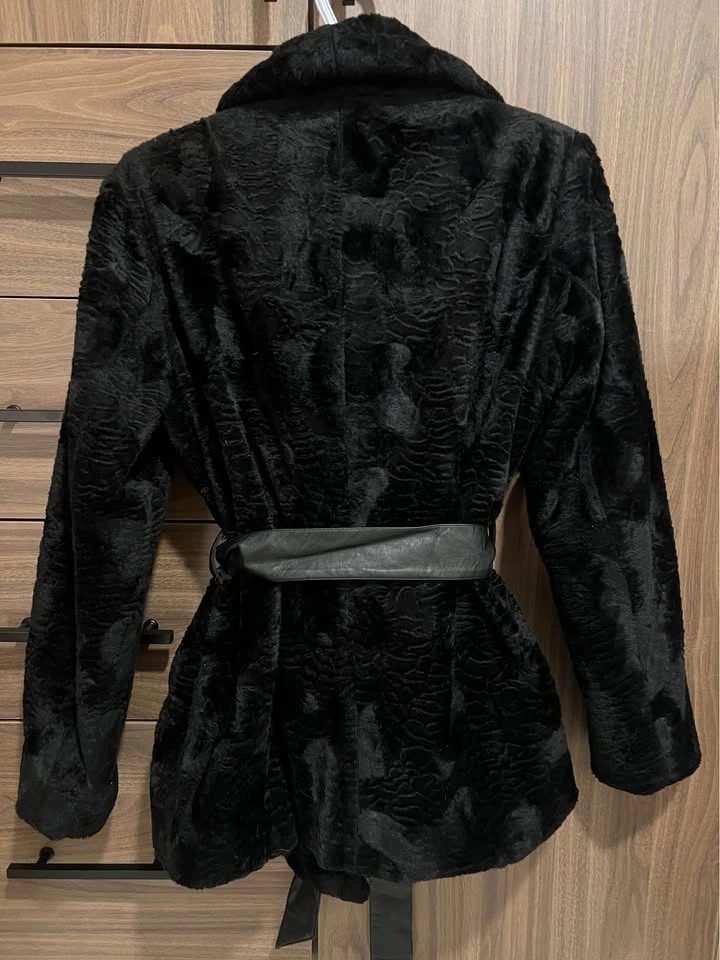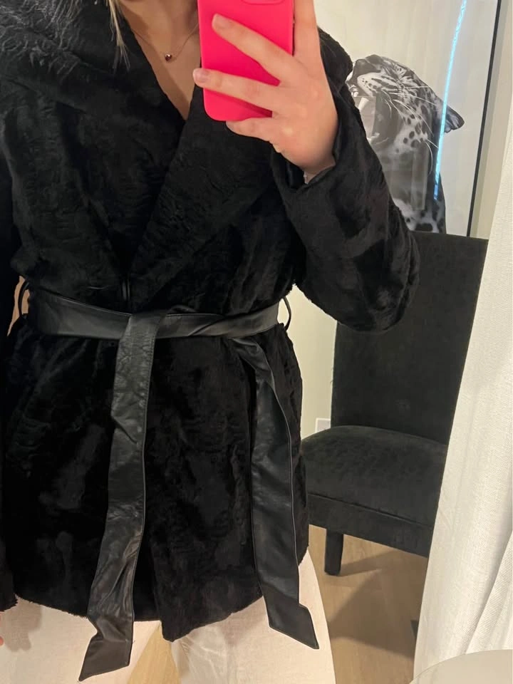 65Size : Size 12 but fits like a small Condition : Used - good Colour : Black This jacket is so cute, has a black leather belt and a front button! Pickup in SW
