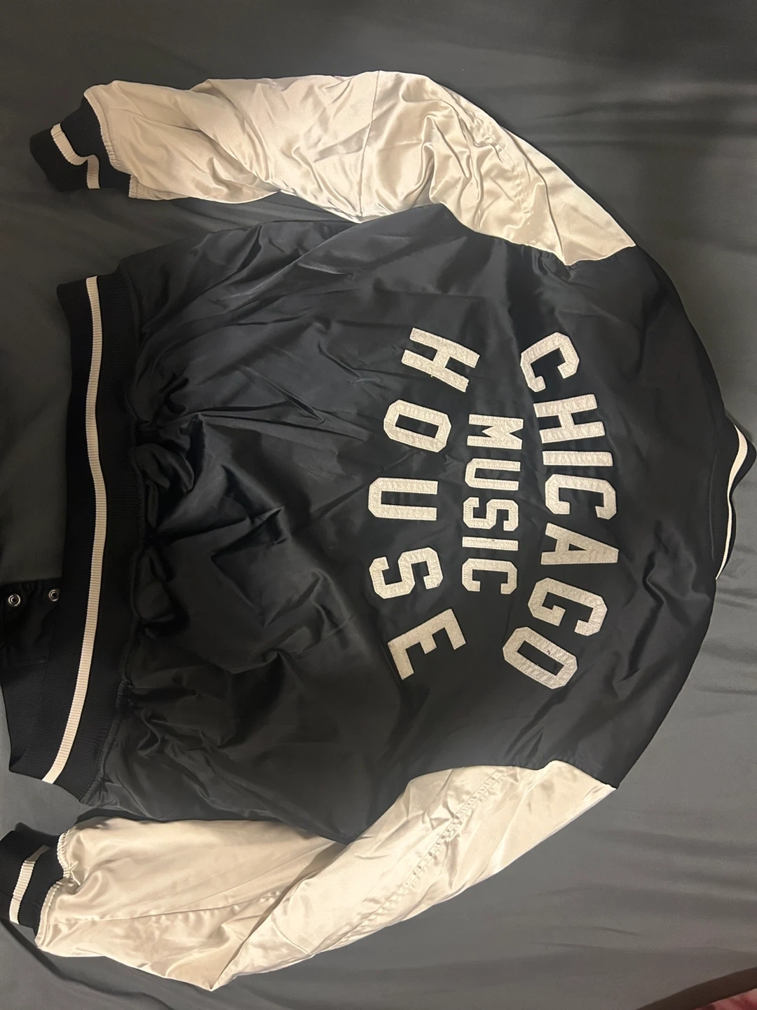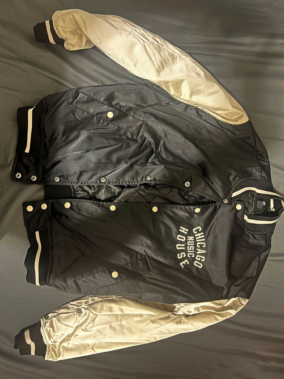 10Selling a H&M varsity jacket with "Chicago Music House" on the back. It's a size medium and in new condition since it hasn't been worn at all. The jacket is black with cream-coloured sleeves and has white stripes on the cuffs and collar. Perfect for adding a bit of style to your wardrobe!