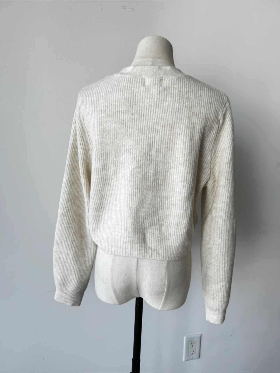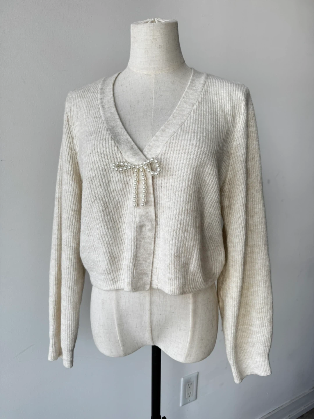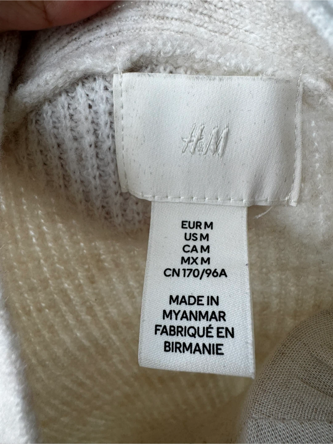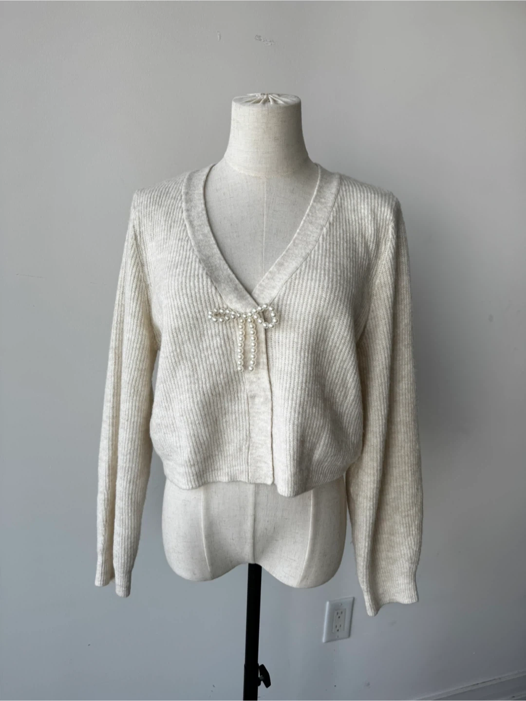 Cozy up with this H&M cream-coloured cardigan! It's a size medium and features a cute pearl detail. Perfect for adding a touch of elegance to any outfit!