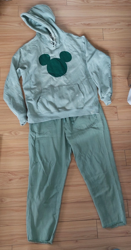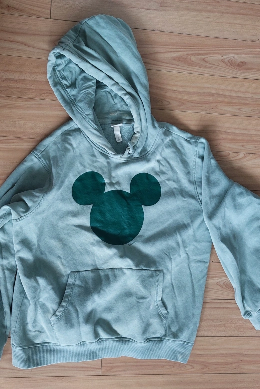 Selling a cute H&M hoodie featuring Mickey Mouse! It's a light green colour and in size medium. It has a cozy hood and a front pocket. Perfect for Disney fans!