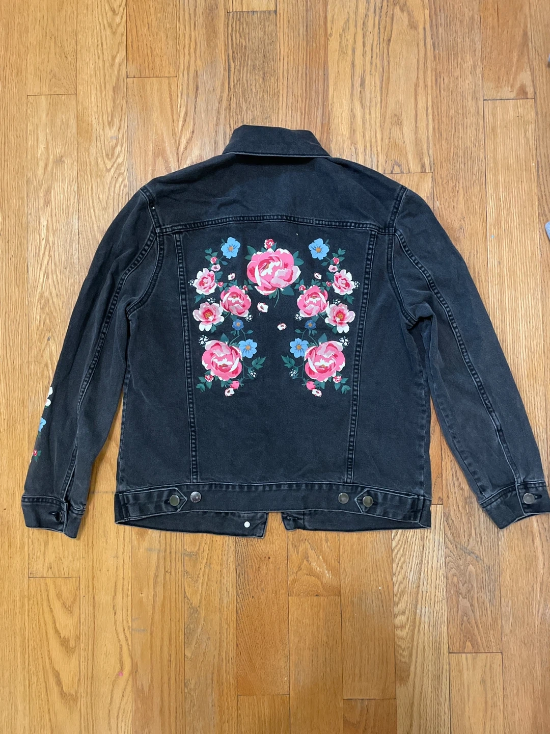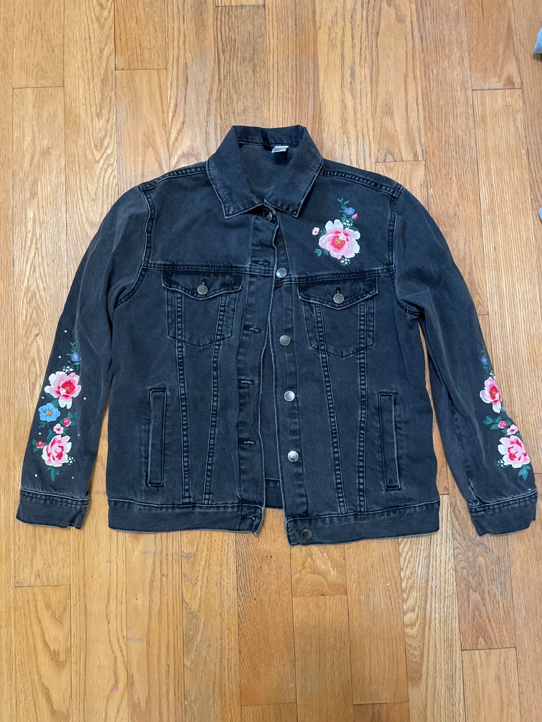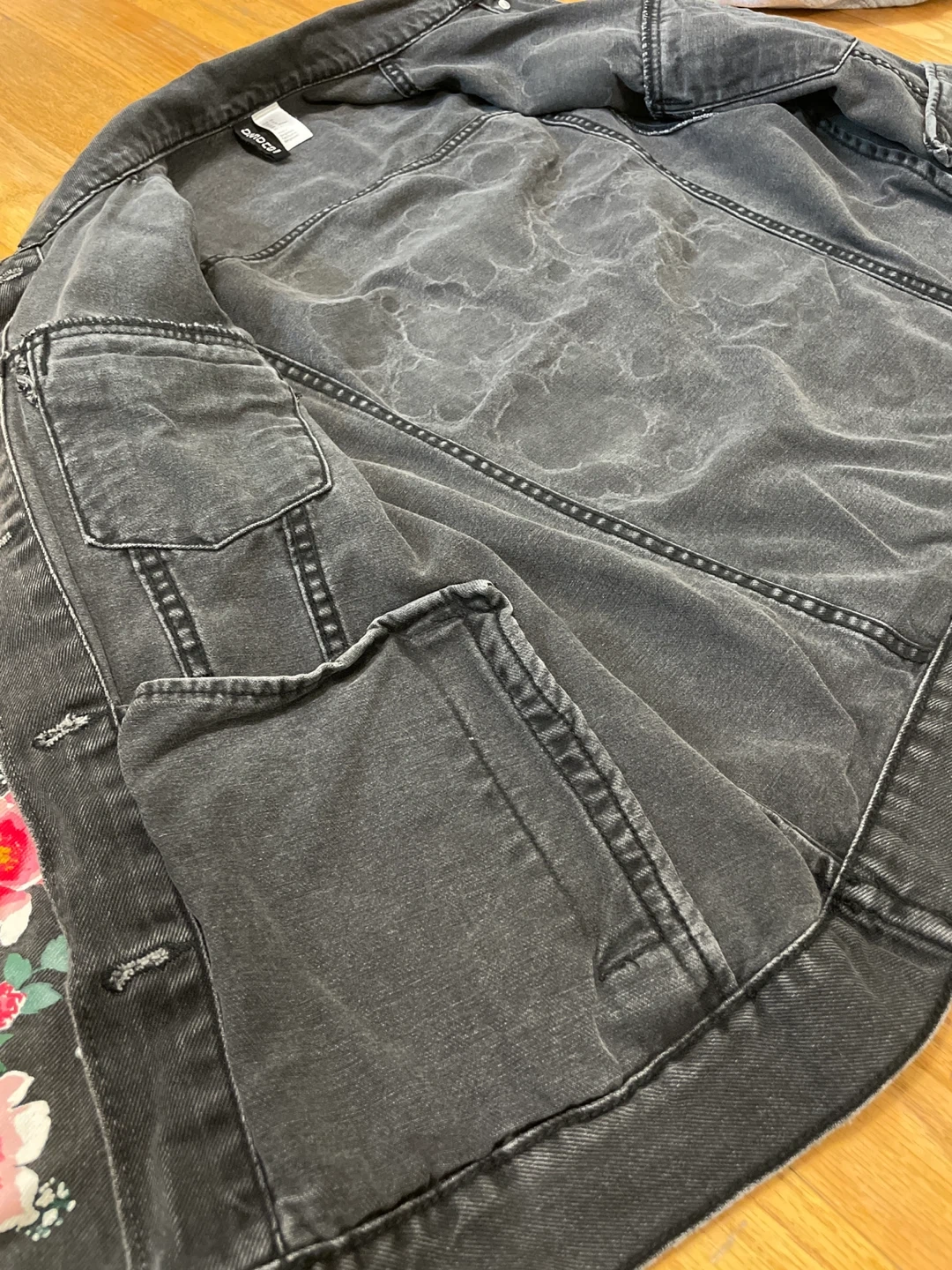 138Selling a H&M Divided denim jacket! It's a size 6 and features a floral design on the front, sleeves, and back. It's made of 100% cotton and is in good condition. It also has two pockets on the inside of the jacket. Accepting only cash.