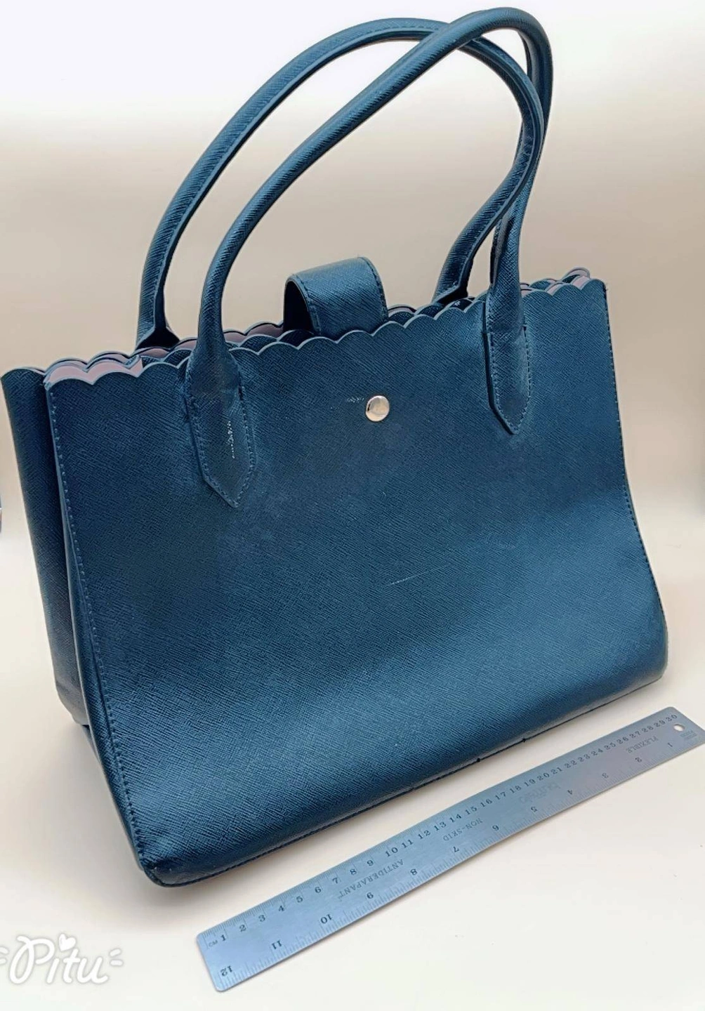 54H & M Edge tote bag in faux leather with top handles and snap closure—elegant, spacious carryall for daily essentials, about 12 inches wide.
